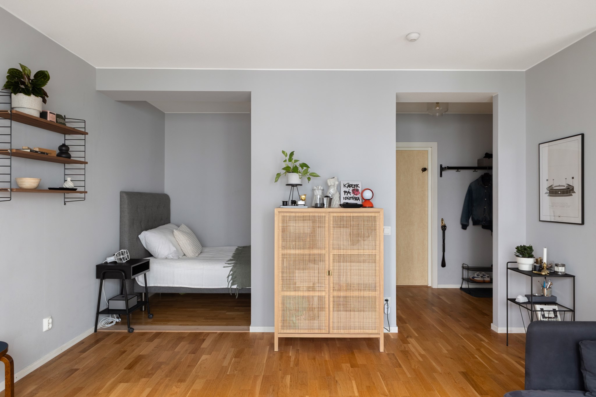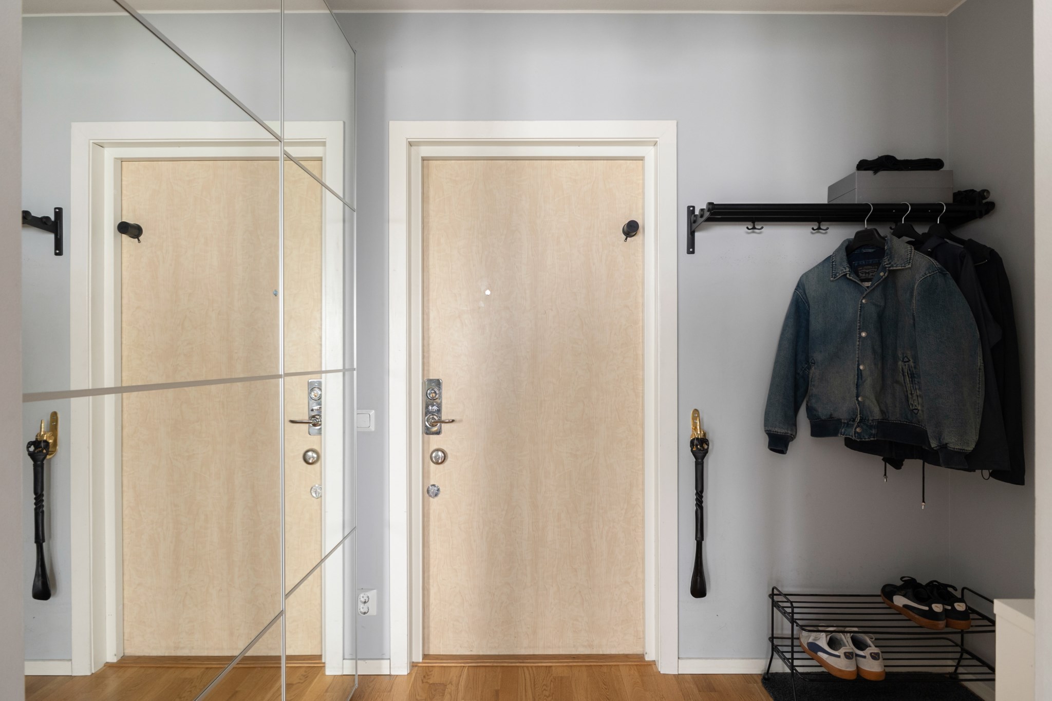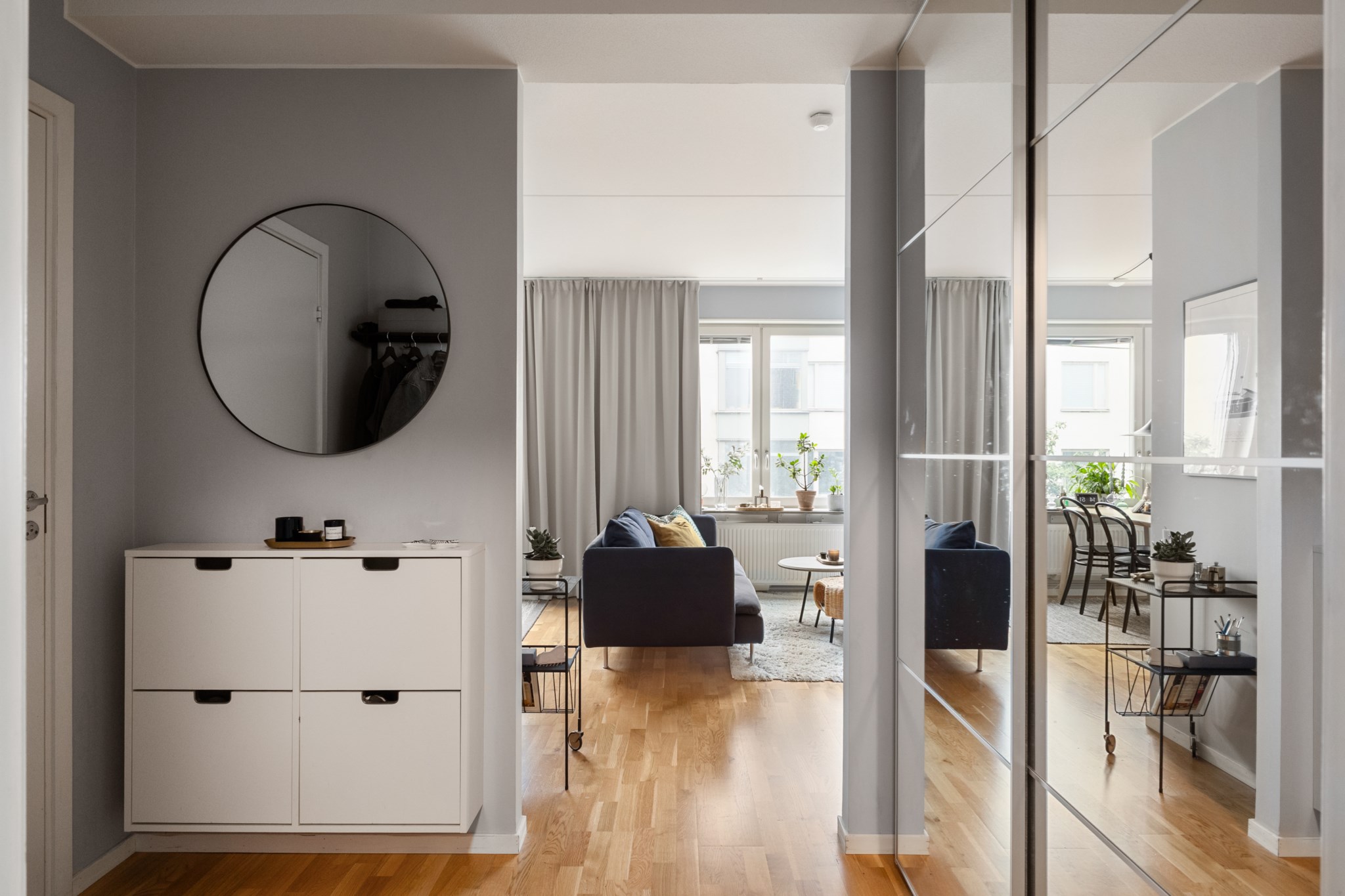 Välkomnande hall med bra avhängningsmöjligheter i form av hatthylla samt skjutdörrsgarderob. Hallen öppnar upp lägenheten på ett trevligt sätt och man möts direkt av dess luftiga karaktär. Lägenheten är utrustad med säkerhetsdörr.