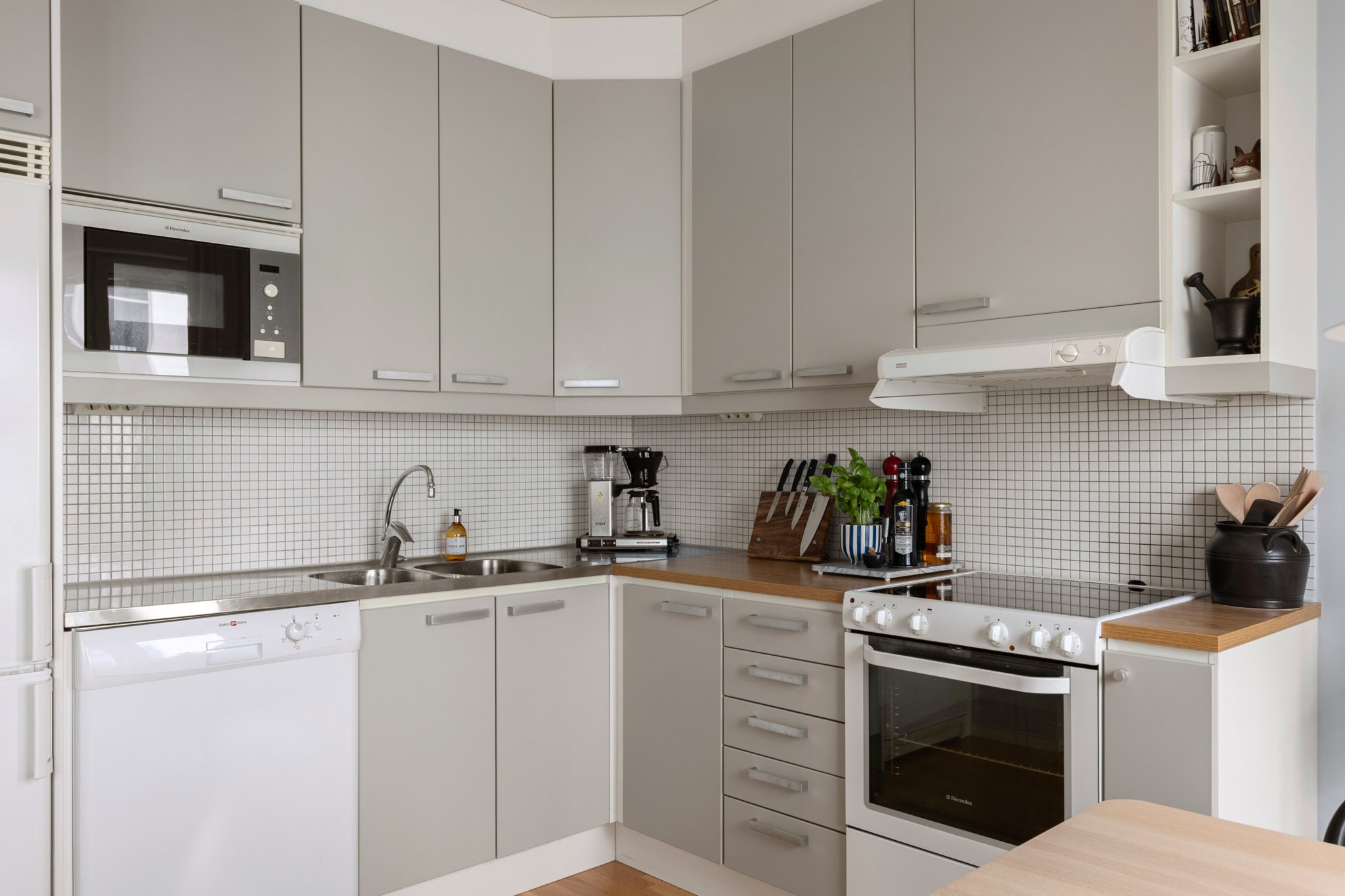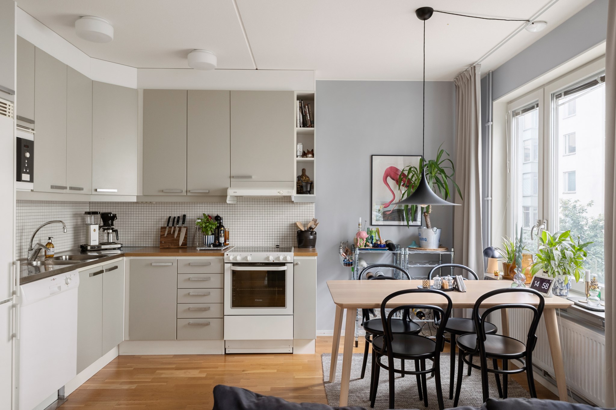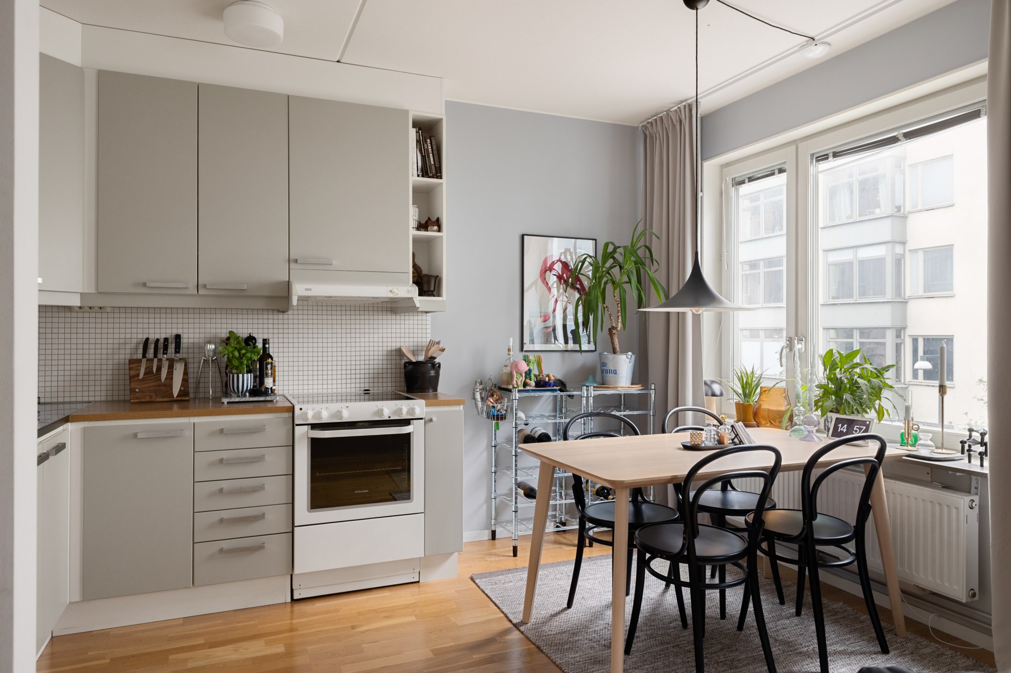 Stilrent och modernt kök med plats för matbord och stolar. Här finns gott om förvarings- och avställningsytor. De ljusa luckorna är uppdaterade med moderna beslag och ovan den snygga bänkskivan i trä sitter vit mosaik. Köksutrustningen består av kyl/frys, diskmaskin, spis, ugn, microvågsugn samt spisfläkt.