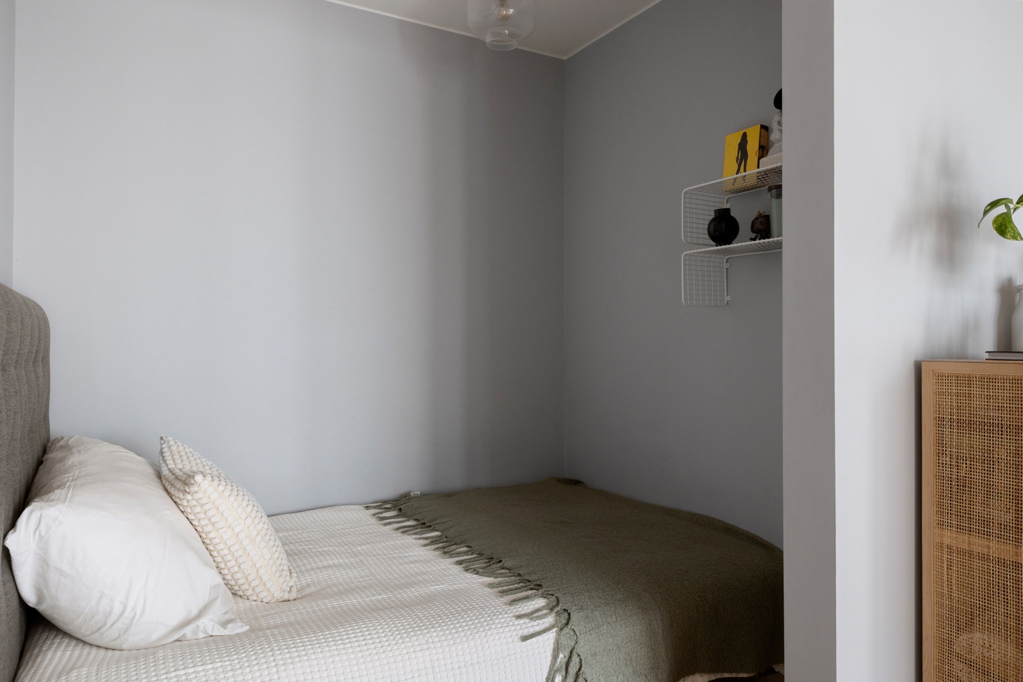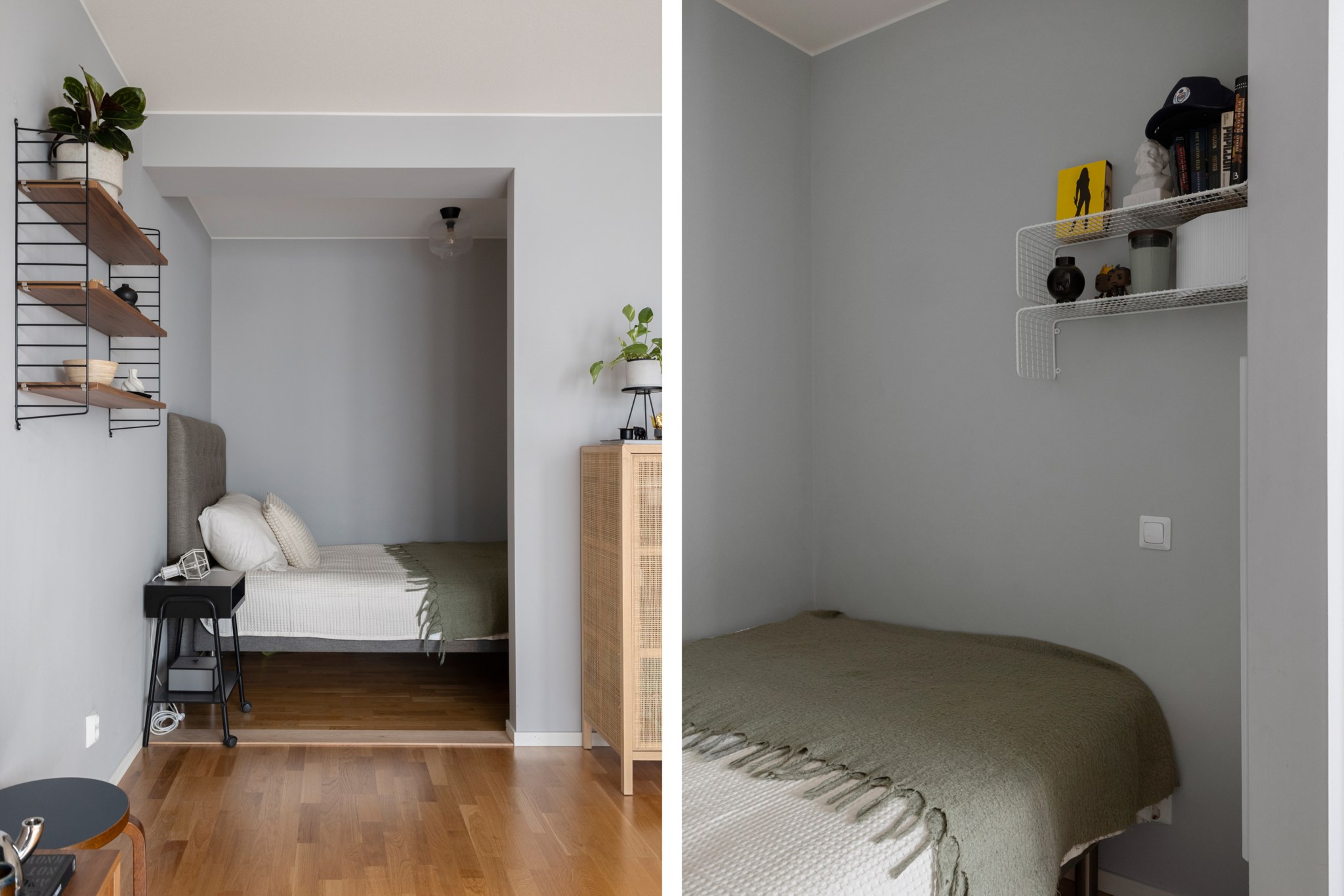 I direkt anslutning till vardagsrummet finns en praktiskt inredd sovalkov.