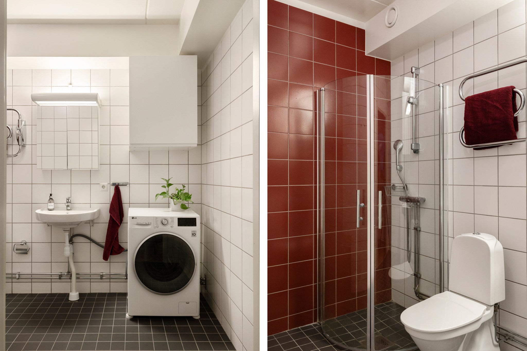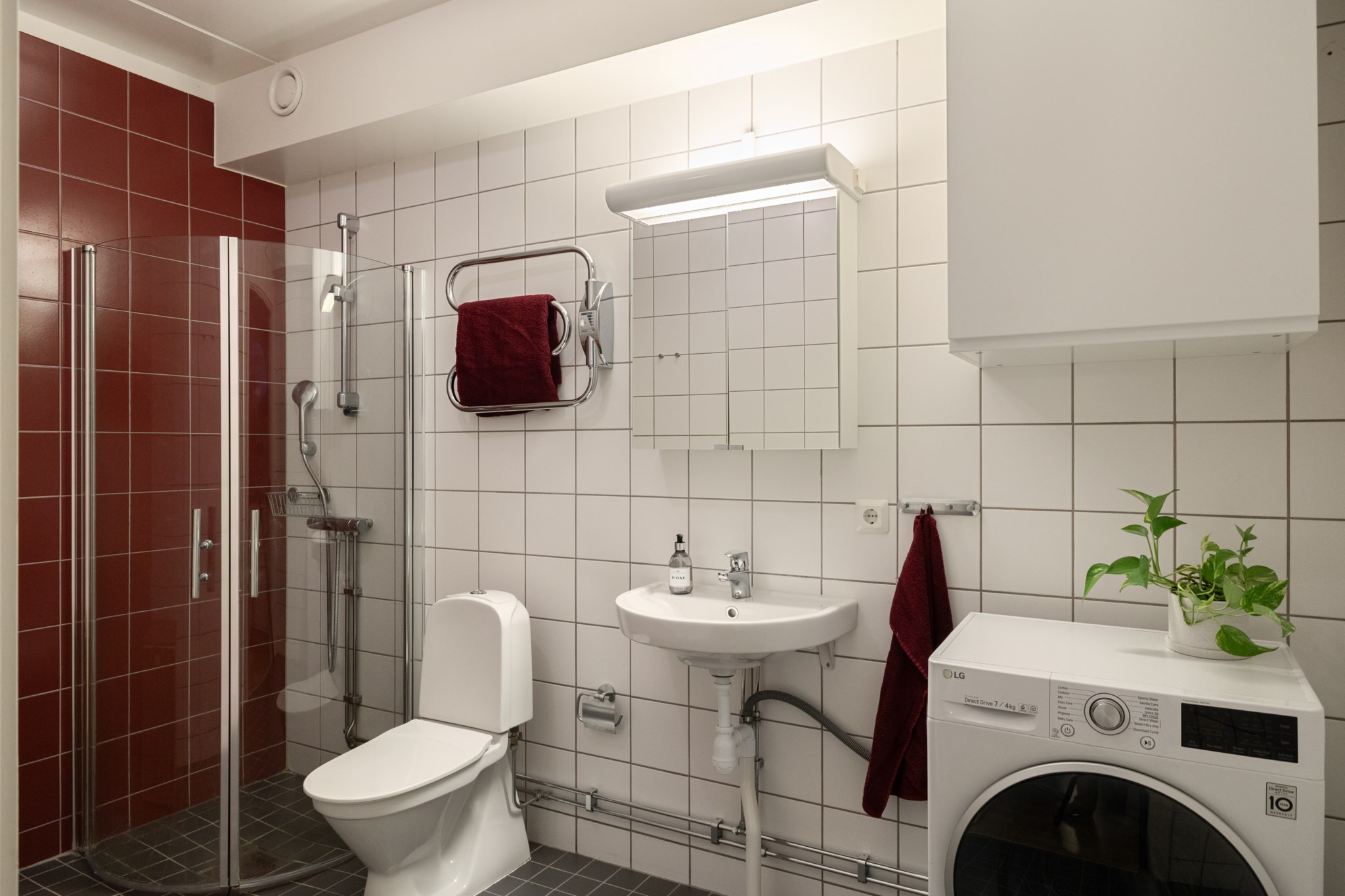 Rymligt badrum med helkaklade väggar och klinkergolv med golvvärme. Badrumsutrustningen består av wc, dusch, kombinerad tvättmaskin & torktumlare, tvättställ, handdukstork samt spegelskåp. Extra förvaring i vägghängt linneskåp.