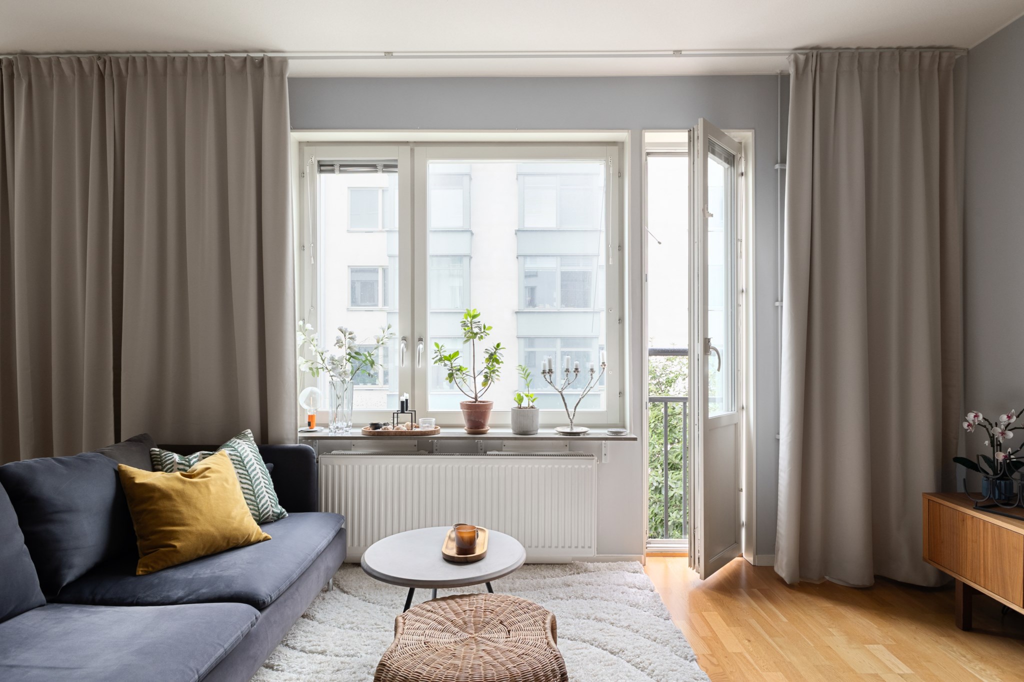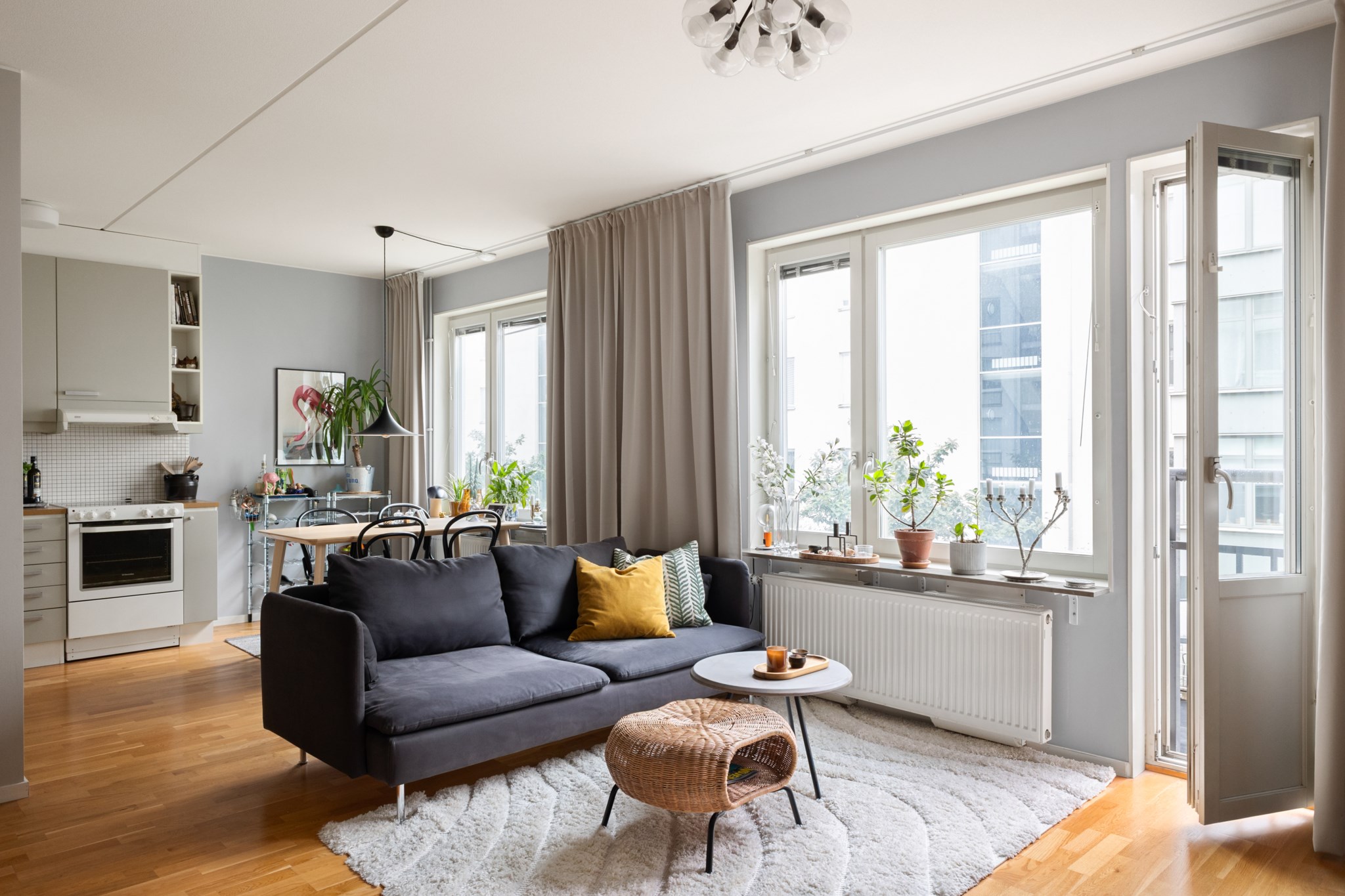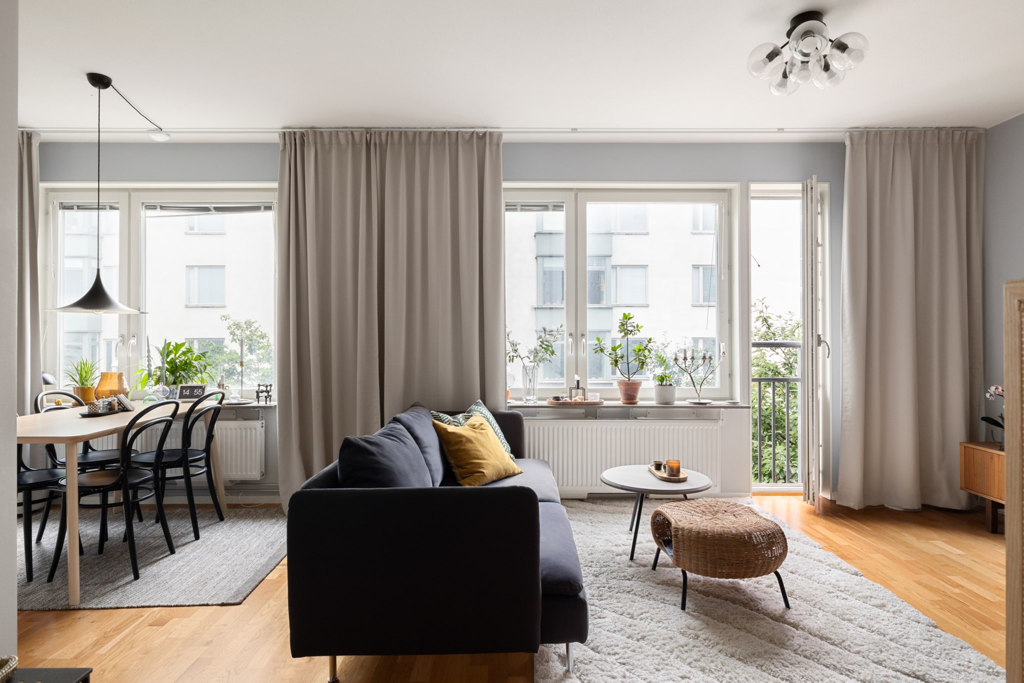 Vardagsrummet ligger i öppen planlösning mot köket vilken ger en mycket rymlig och social yta. Flera stora fönsterpartier samt en charmig fransk balkong i västerläge ger ett vackert ljusinsläpp i hela rummet. Här finns olika möbleringsalternativ och rummet rymmer både soffa, bord och övrigt möblemang.