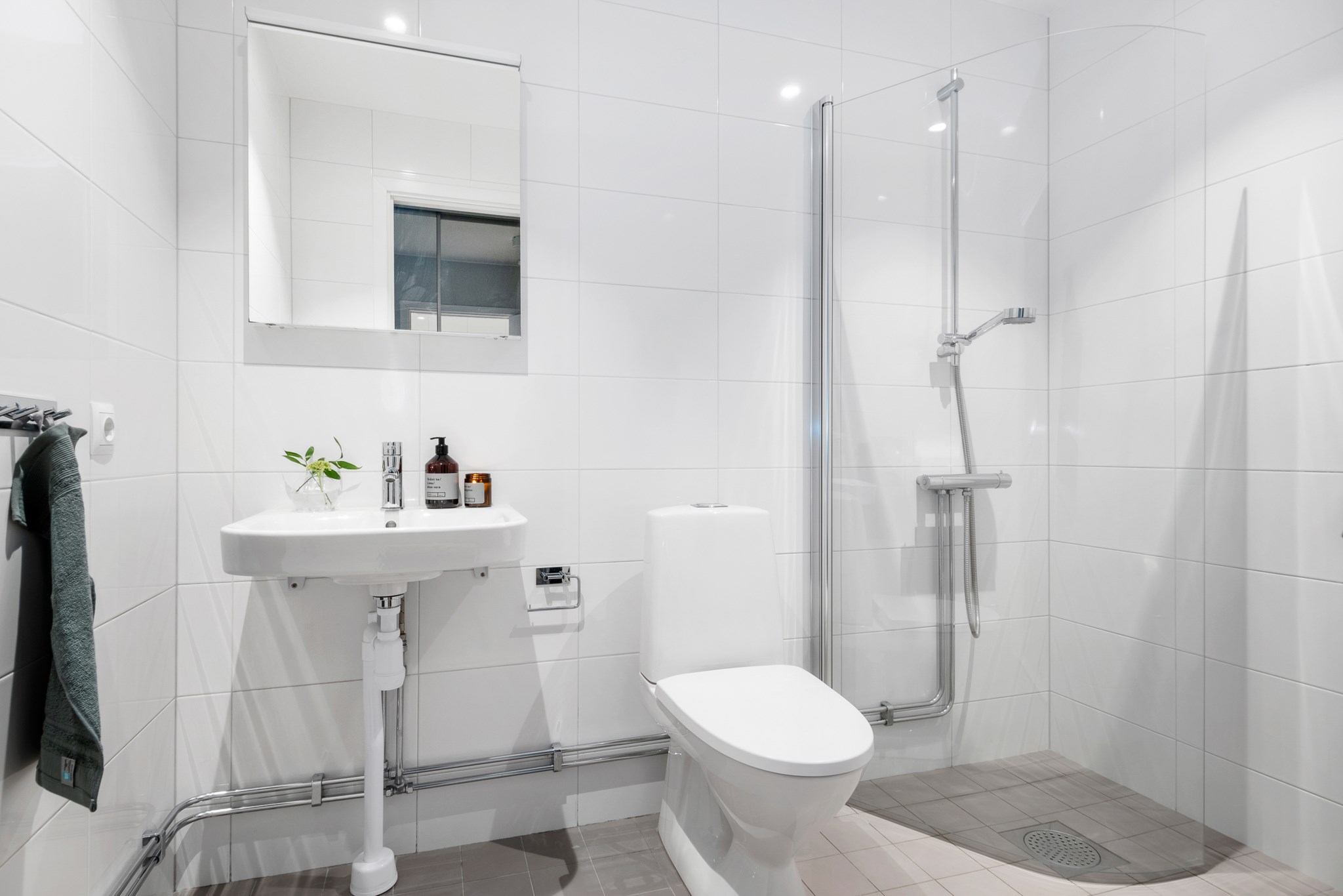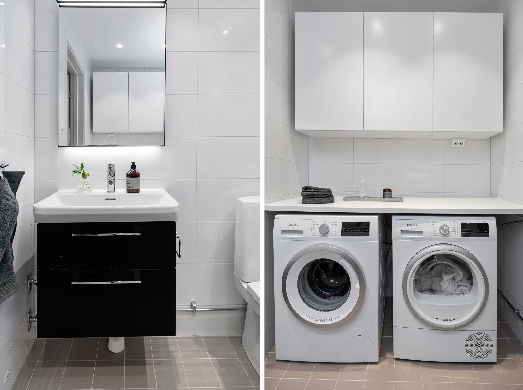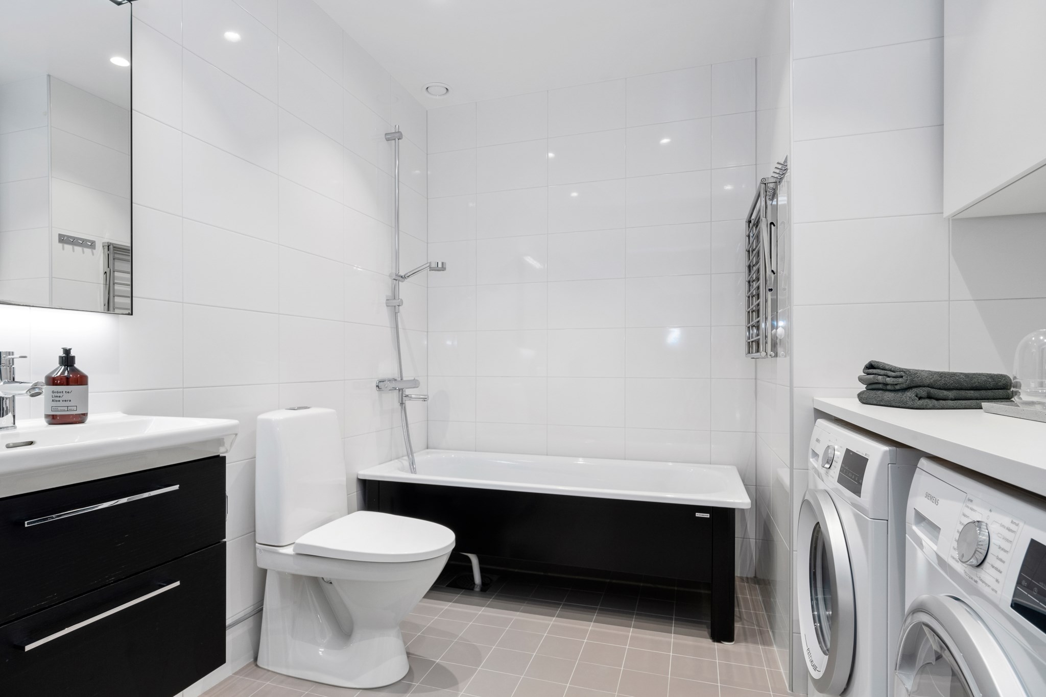 Lägenhetens badrum är väl placerade i hallen . Det största av dem med badkar, och en praktisk tvättavdelning med tillhörande förvaring. I hallen finner ni ytterligare ett badrum med dusch.