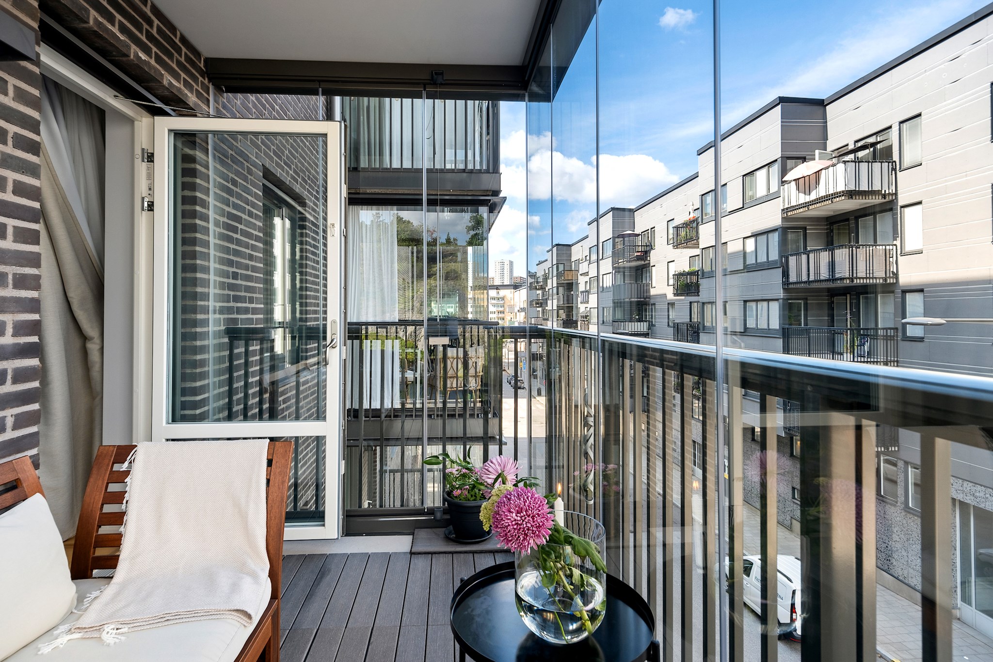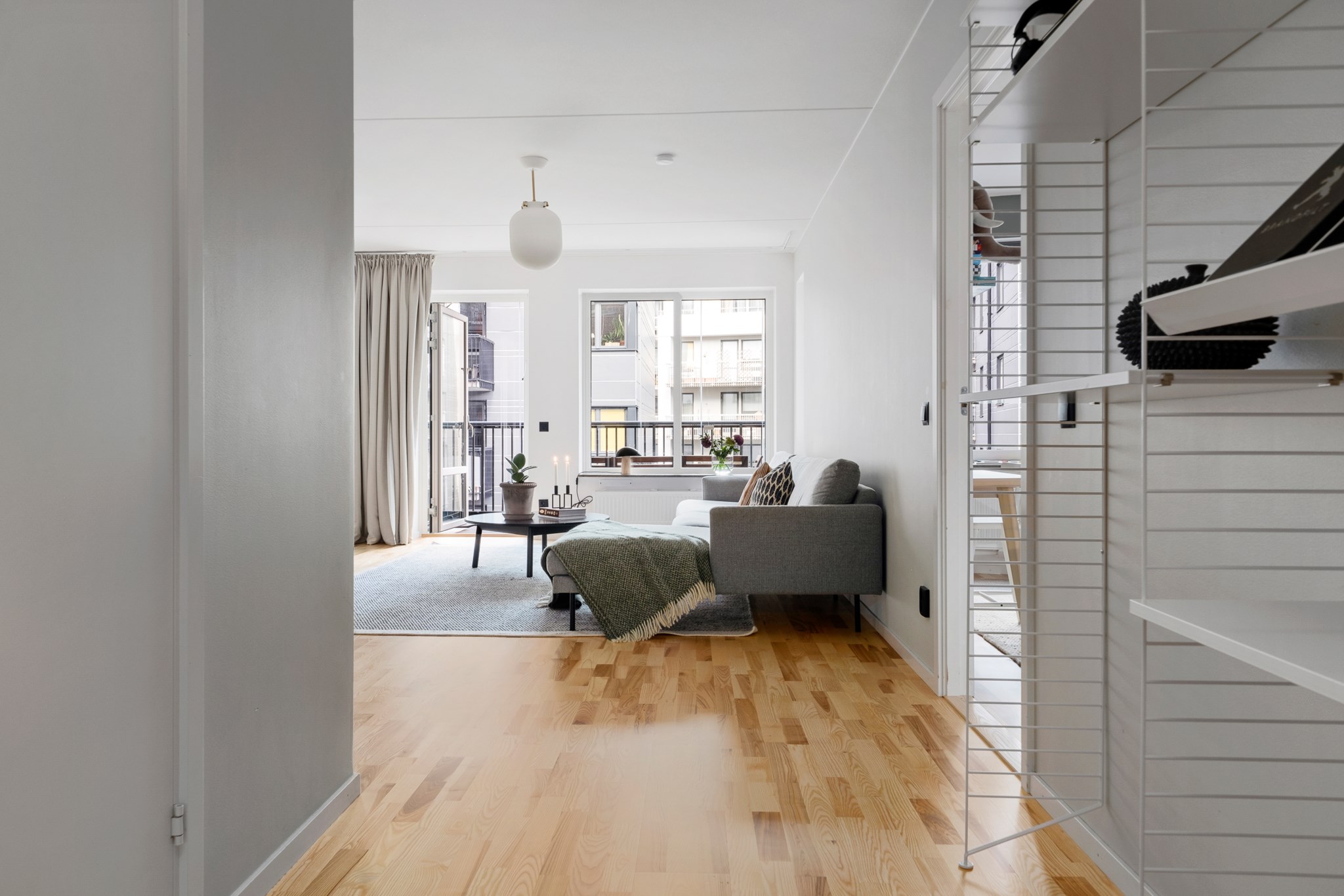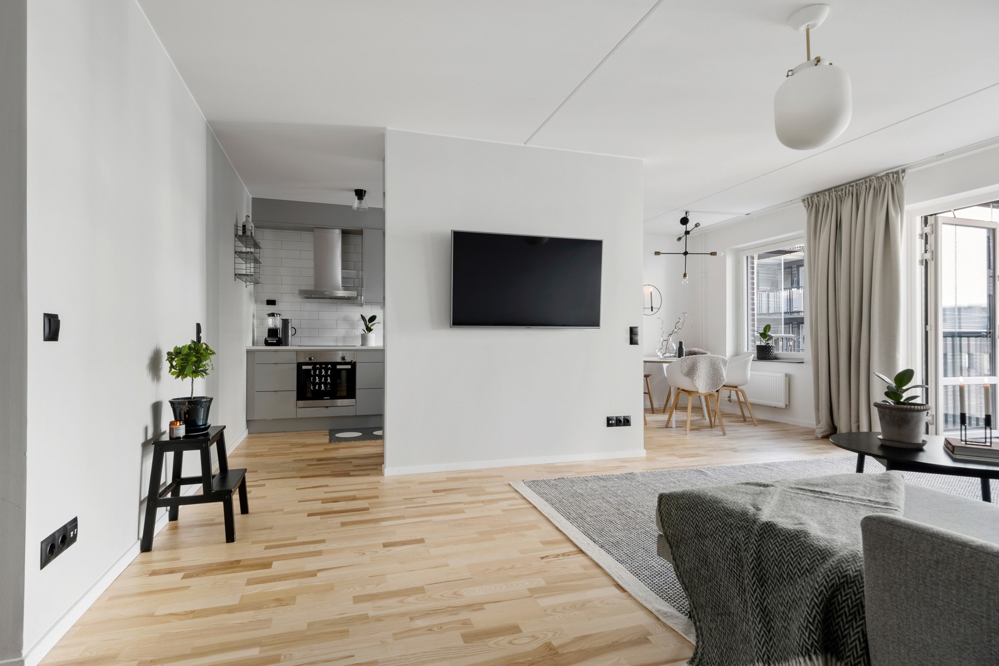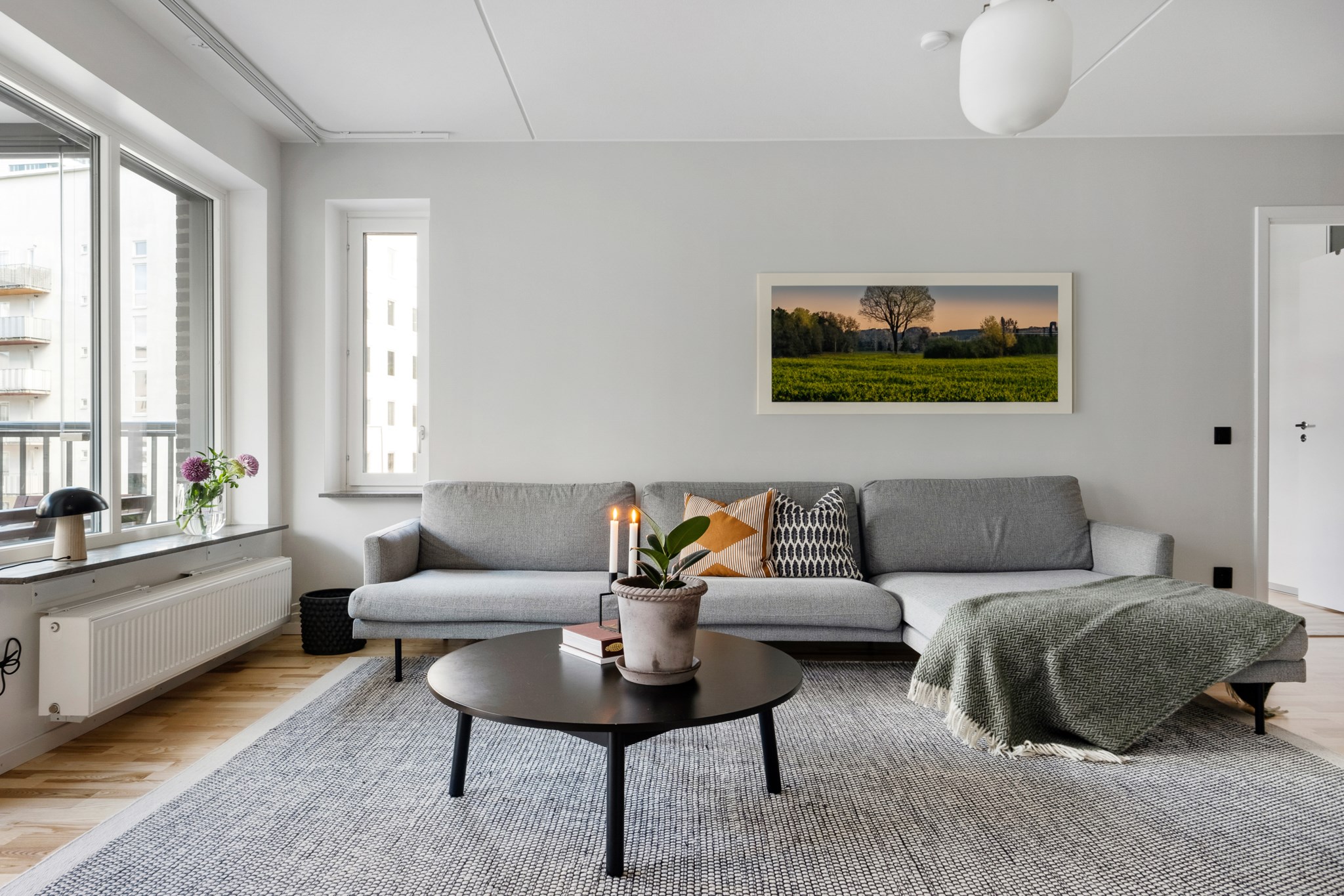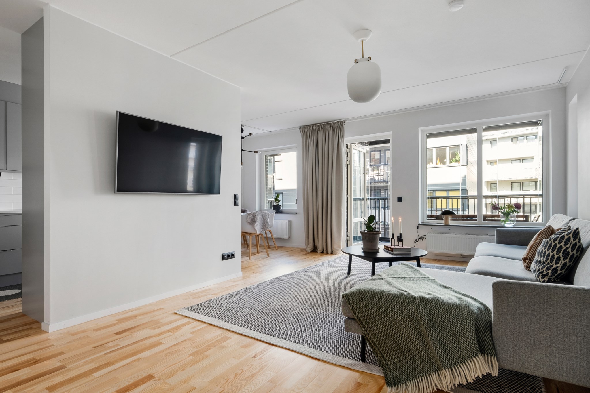 Vardagsrummet är rymligt med ordentliga ljusinsläpp och plats för en stor soffgrupp. Härifrån tar ni er enkelt ut till den stora inglasade balkongen som nyttjas som ett härligt uterum, vår, sommar och höst.