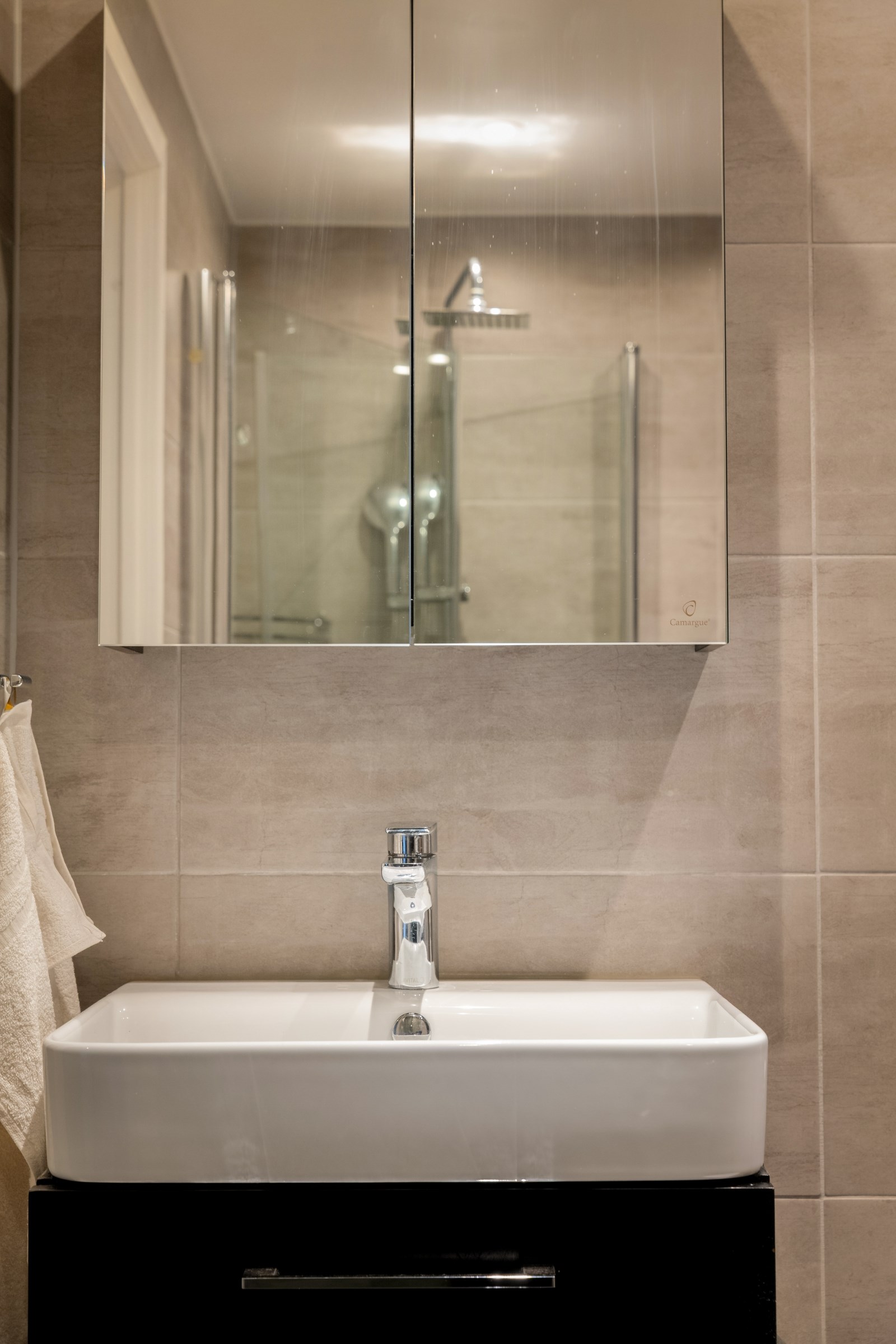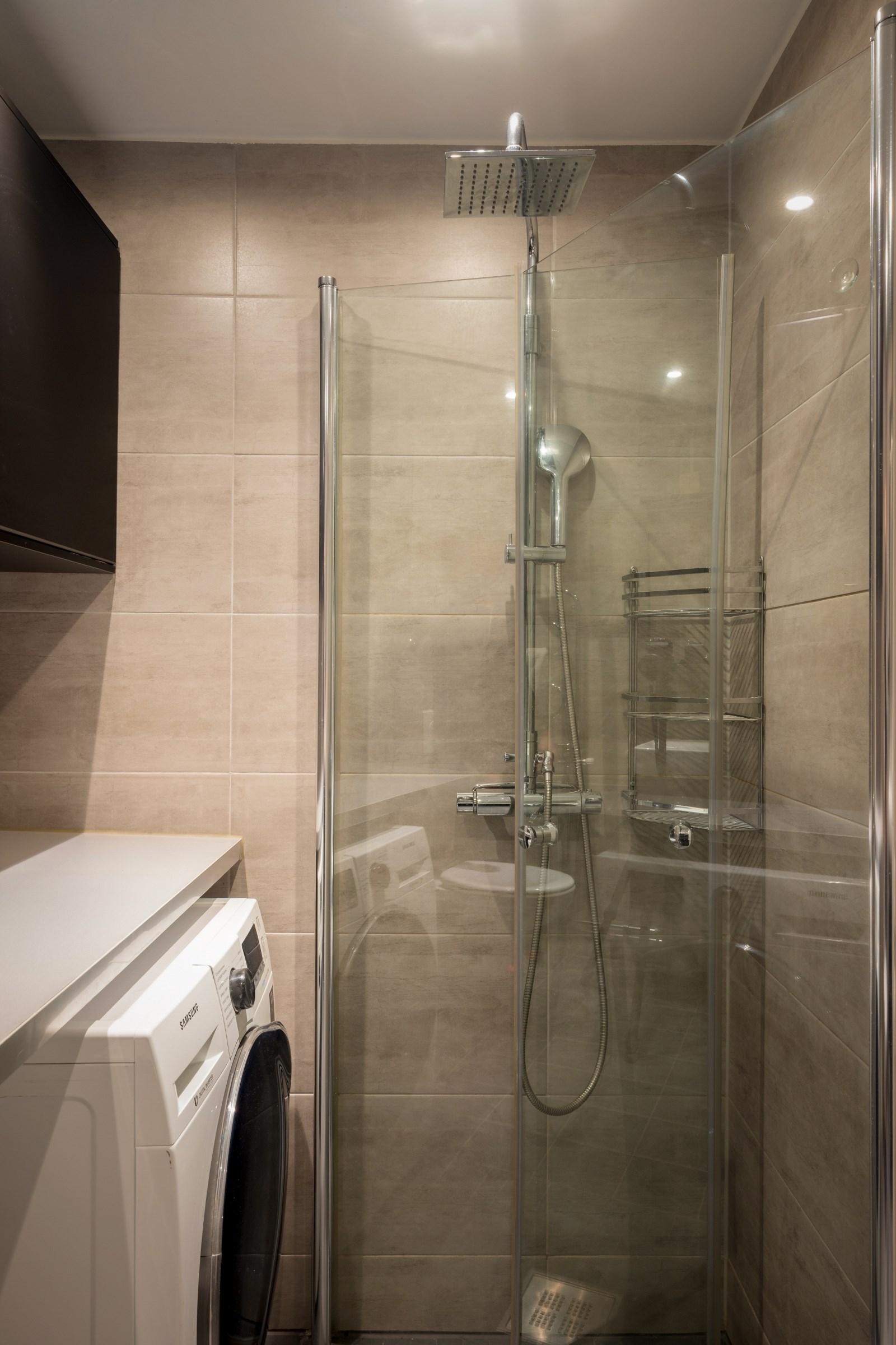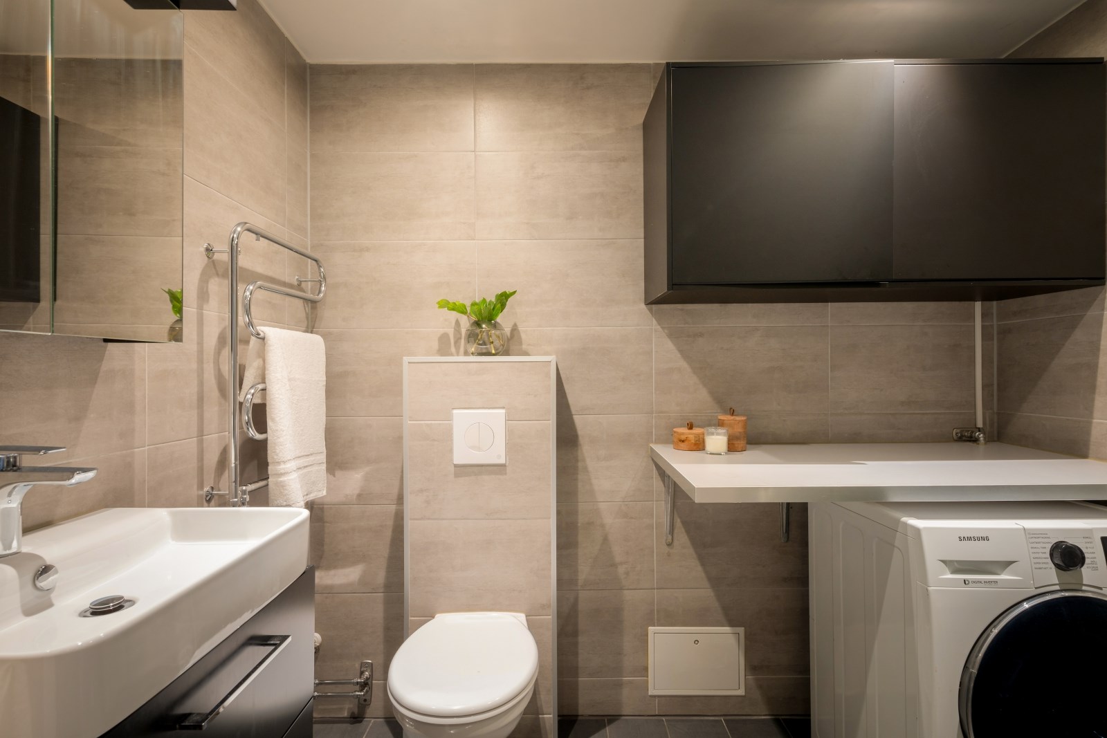 Stort läckert helkaklat badrum med spotlights i tak och golvvärme. Detta är ett badrum man gärna spenderar tid i! Utrustningen består av: vägghängd wc, dusch, kombinerad tvättmaskin torktumlare, vattenburen handdukstork, kommod, spegelskåp, arbetsbänk samt överskåp.