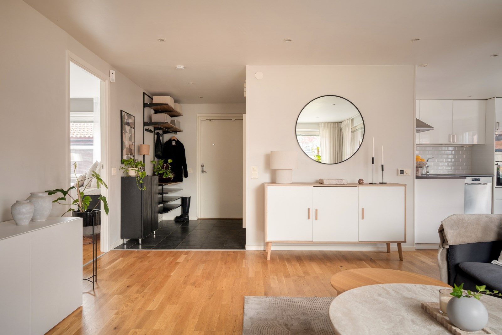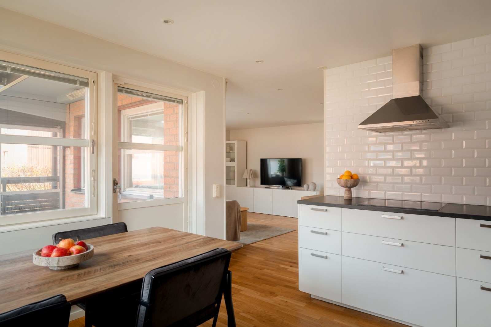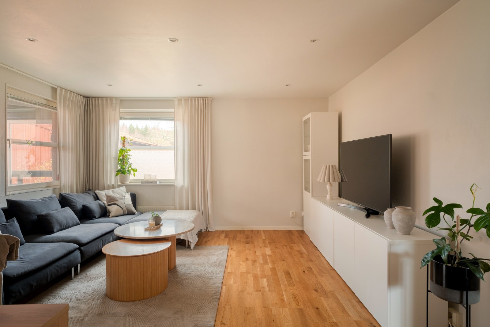 Rakt fram från hallen ligger det rymliga vardagsrummet med fönster i två väderstreck, spotlights i tak och parkettgolv. Här finns gott om plats för både soffgrupp, tv-bänk och mer därtill. Från vardagsrummet når ni sovrummet och köket.