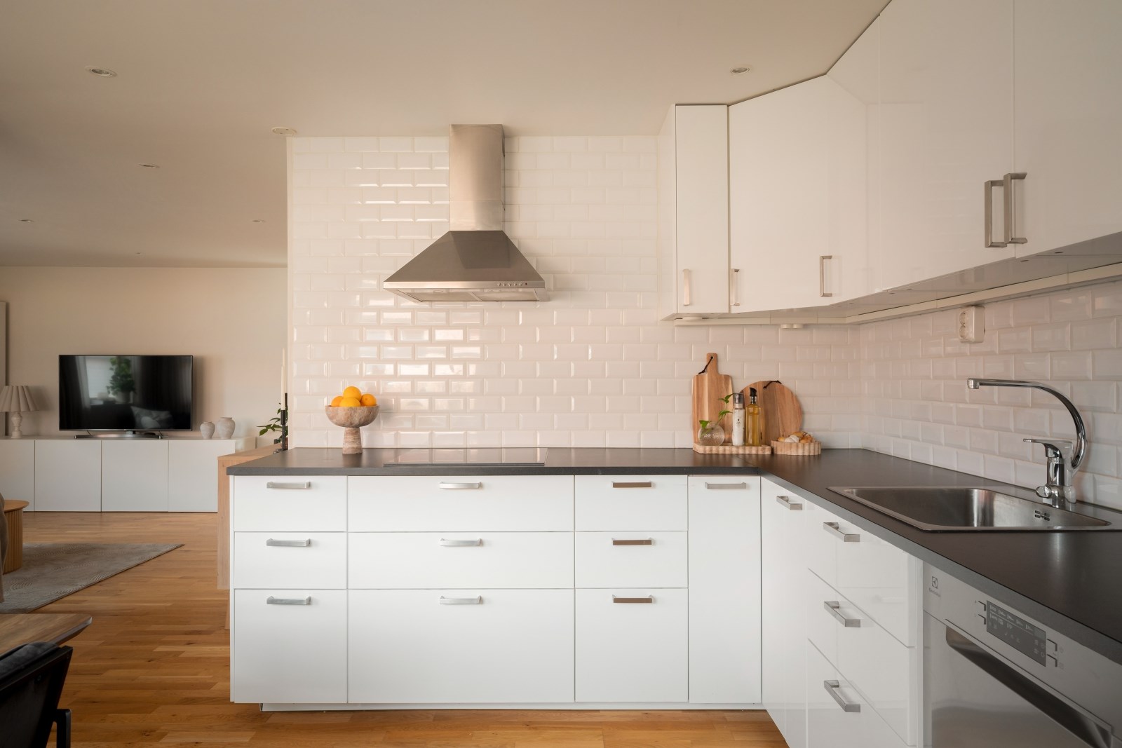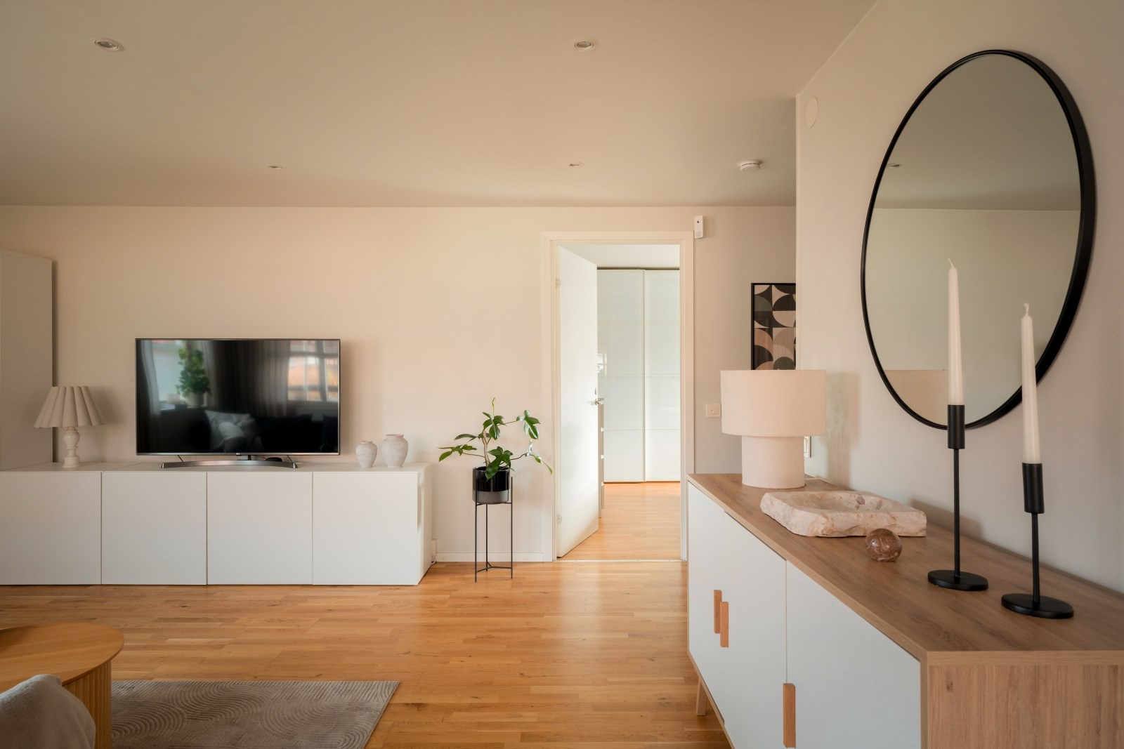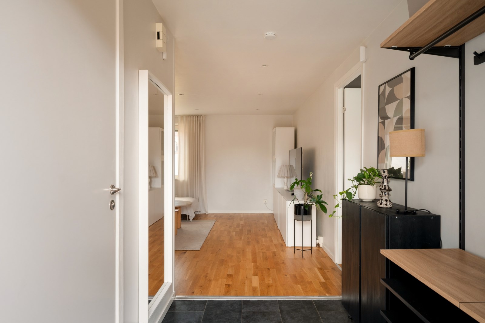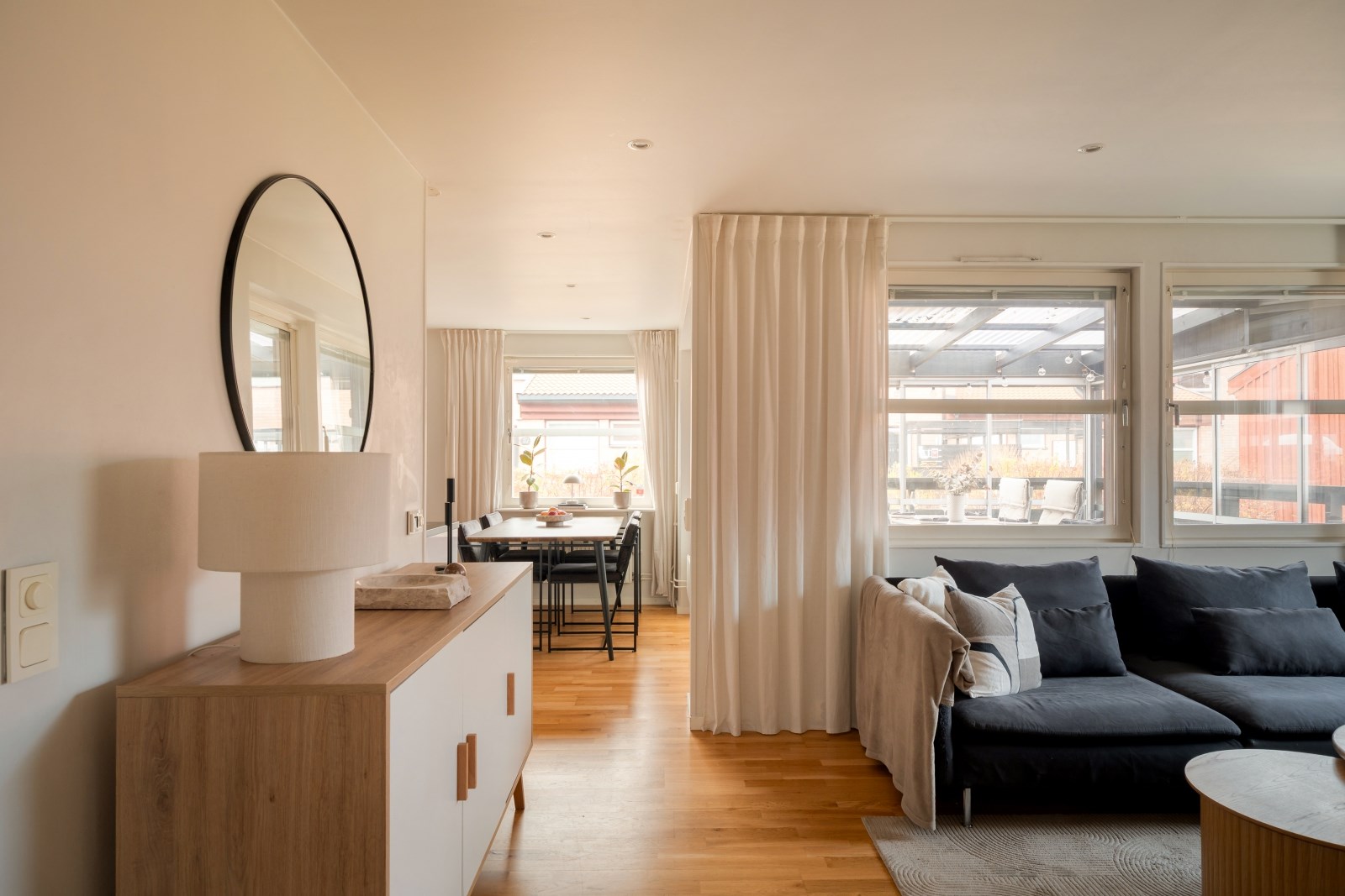 Rakt fram från hallen ligger det rymliga vardagsrummet med fönster i två väderstreck, spotlights i tak och parkettgolv. Här finns gott om plats för både soffgrupp, tv-bänk och mer därtill. Från vardagsrummet når ni sovrummet och köket.