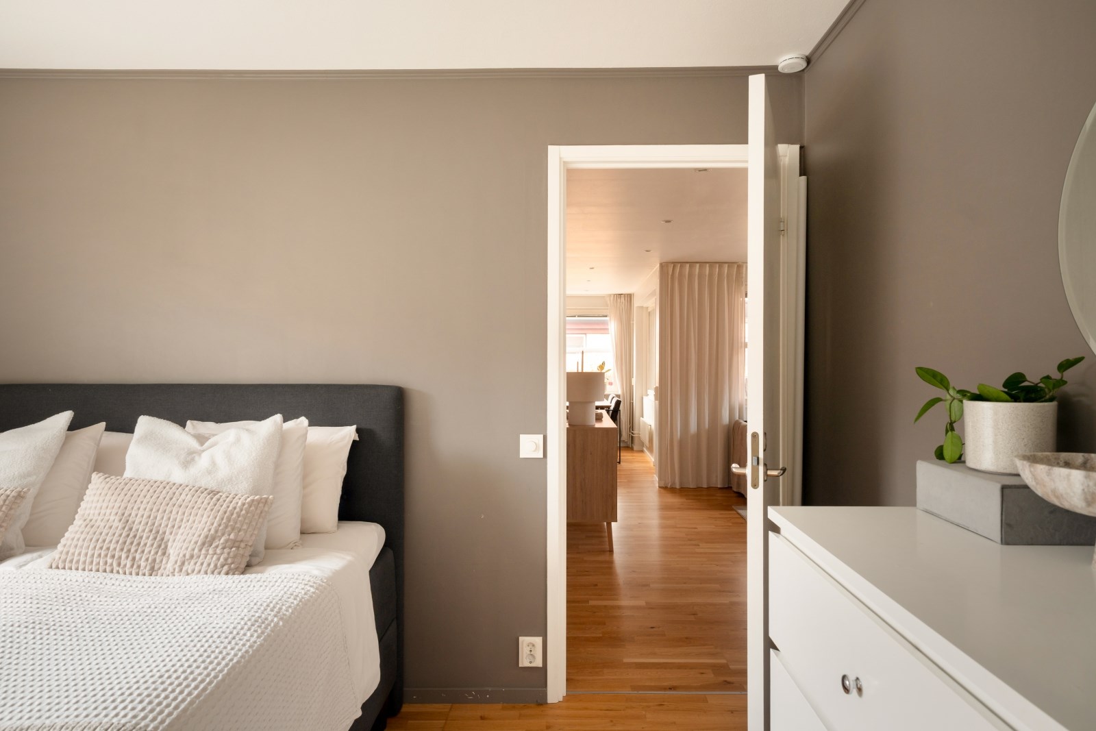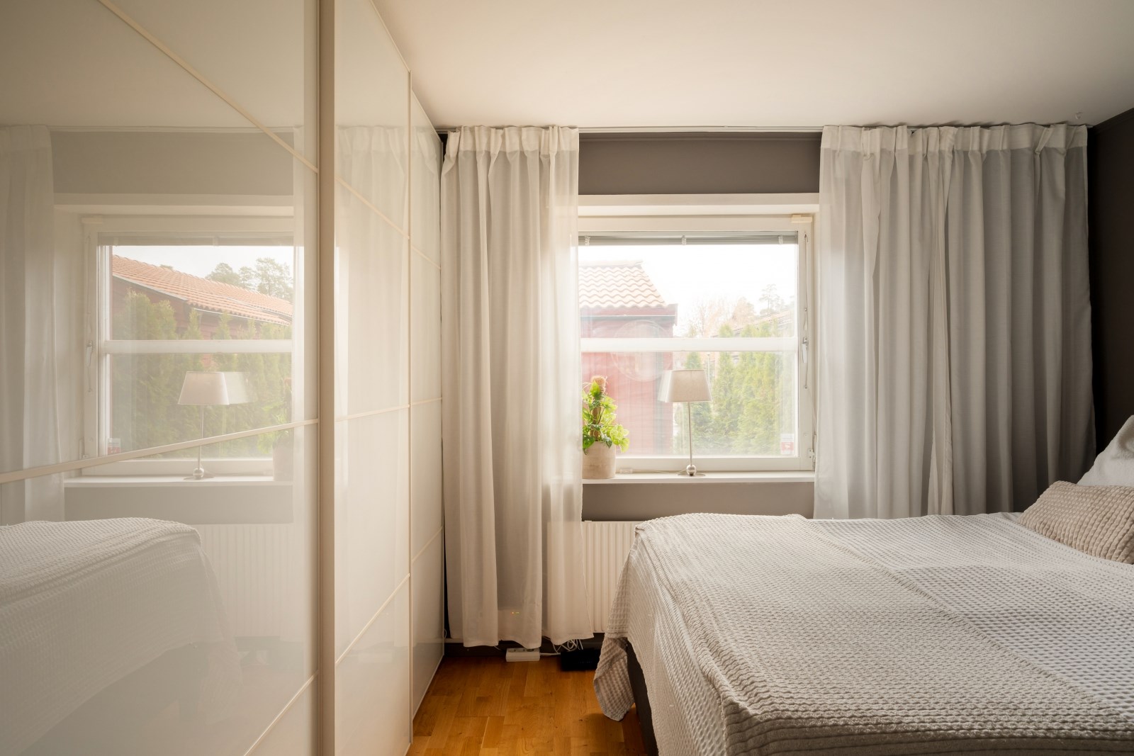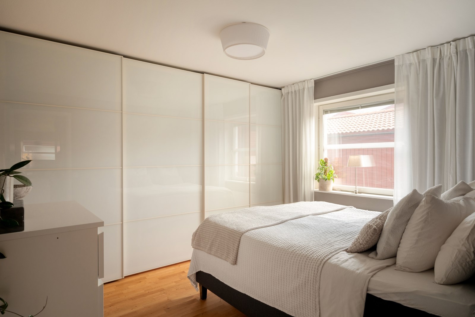 Rofyllt sovrum med parkettgolv och fönster. Här finns plats med dubbelsäng och övrig sovrumsmöblemang. Platsbyggda garderober längs ena väggen med skjutdörrar som sörjer för förvaringen.