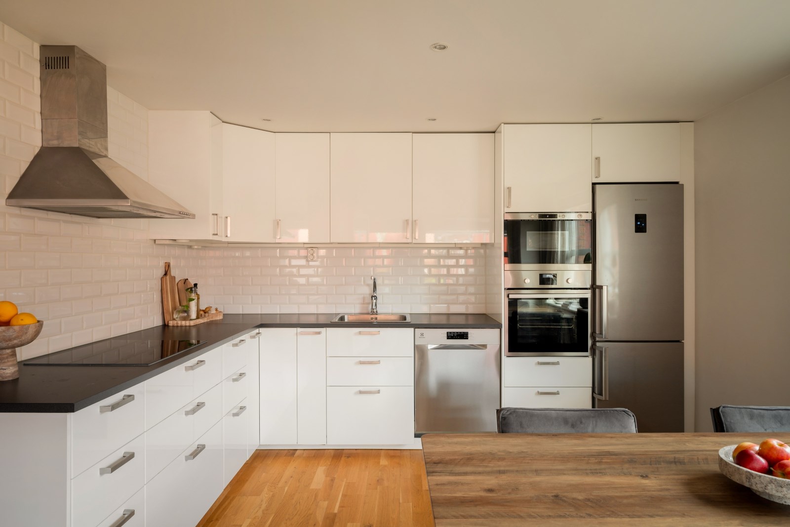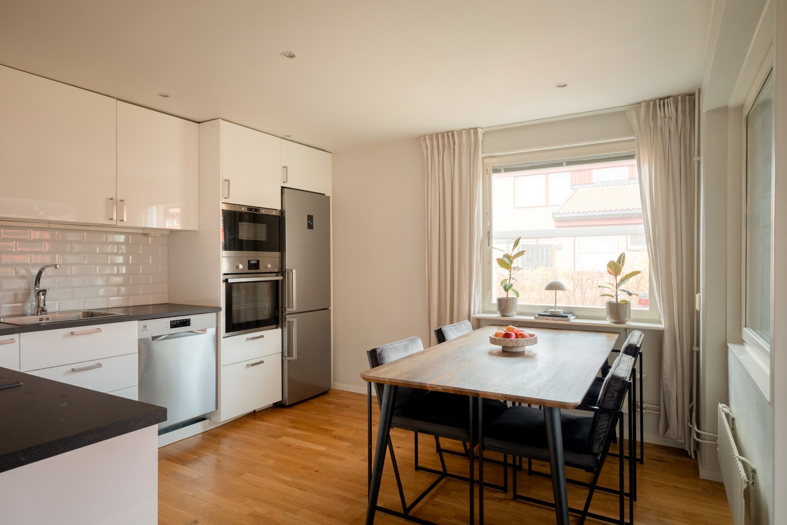 Stilrent fullutrustat kök med golvvärme, parkettgolv och spotlights i tak. Här erbjuds gott om förvaring och mycket bra arbetsytor. Matplats invid fönster i två väderstreck. Kökets maskinella utrustning består av: ny diskmaskin från 2025, varmluftsugn, inbyggd micro, fläkt, induktionshäll samt kombinerad kyl/frys. Från köket är det utgång till lägenhetens inglasade uteplats.