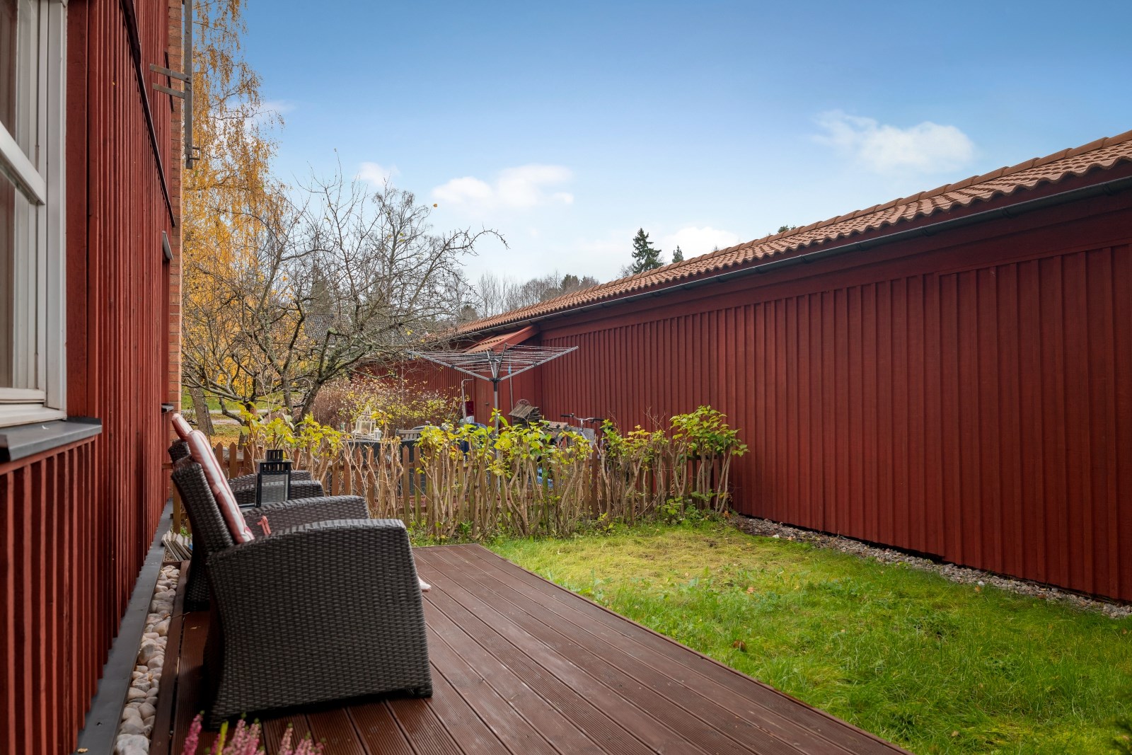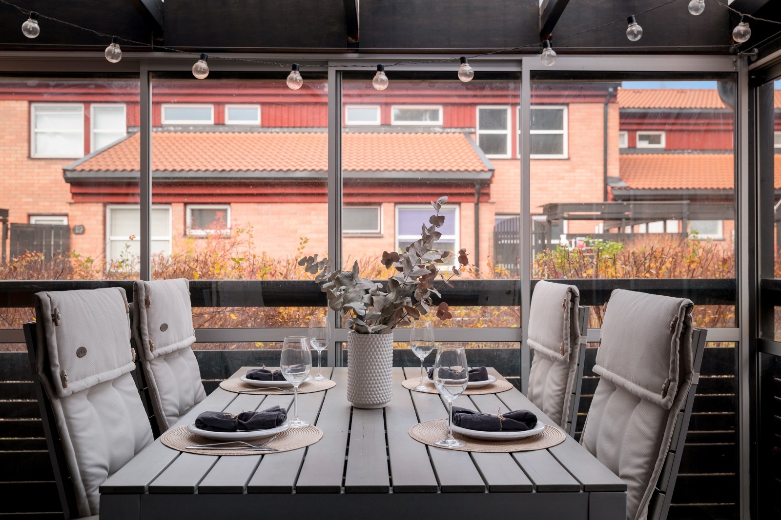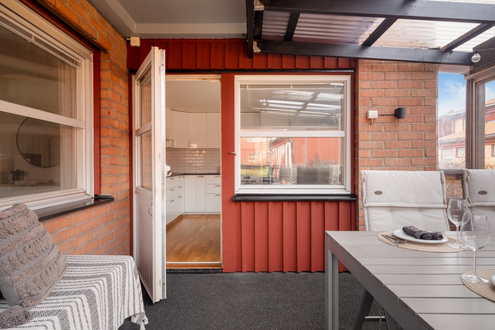 Stor inglasad uteplats. Uteplatsen bjuder på gott om plats att möblera med utemöbler och blommor. Det här kan bli en riktigt mysig plats för avkoppling där de praktiska skjutbara glasdörrarna kan öppnas upp eller stängas till efter säsong. Inglasningen möjliggör också en utökad användning under året.