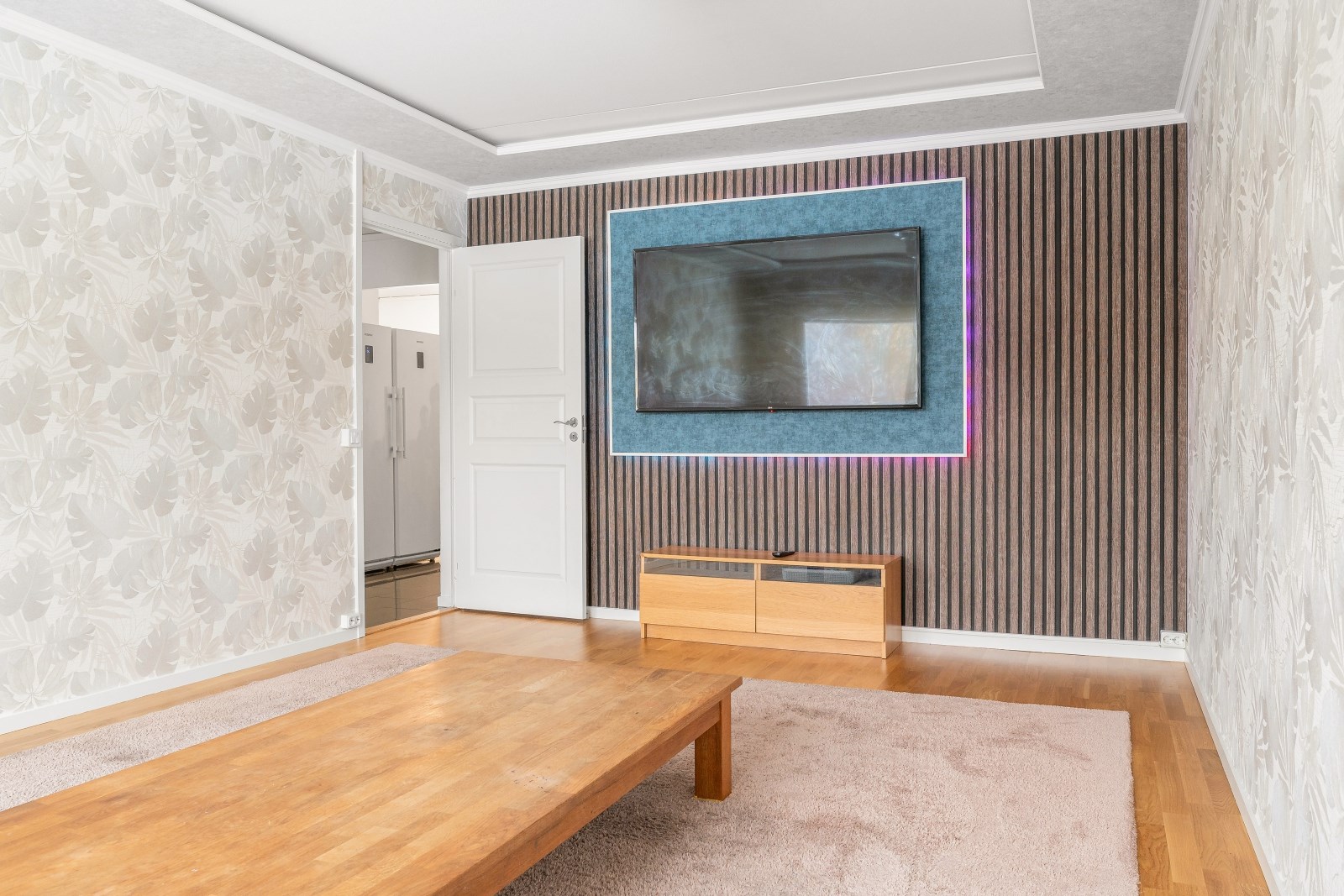 Rymligt och lättmöblerat vardagsrum med parkettgolv, tapetserade väggar, läcker stuckatur i taket med inbyggd belysning samt stora fönsterpartier som släpper in härligt ljus. Här finns gott om plats för möblemang.