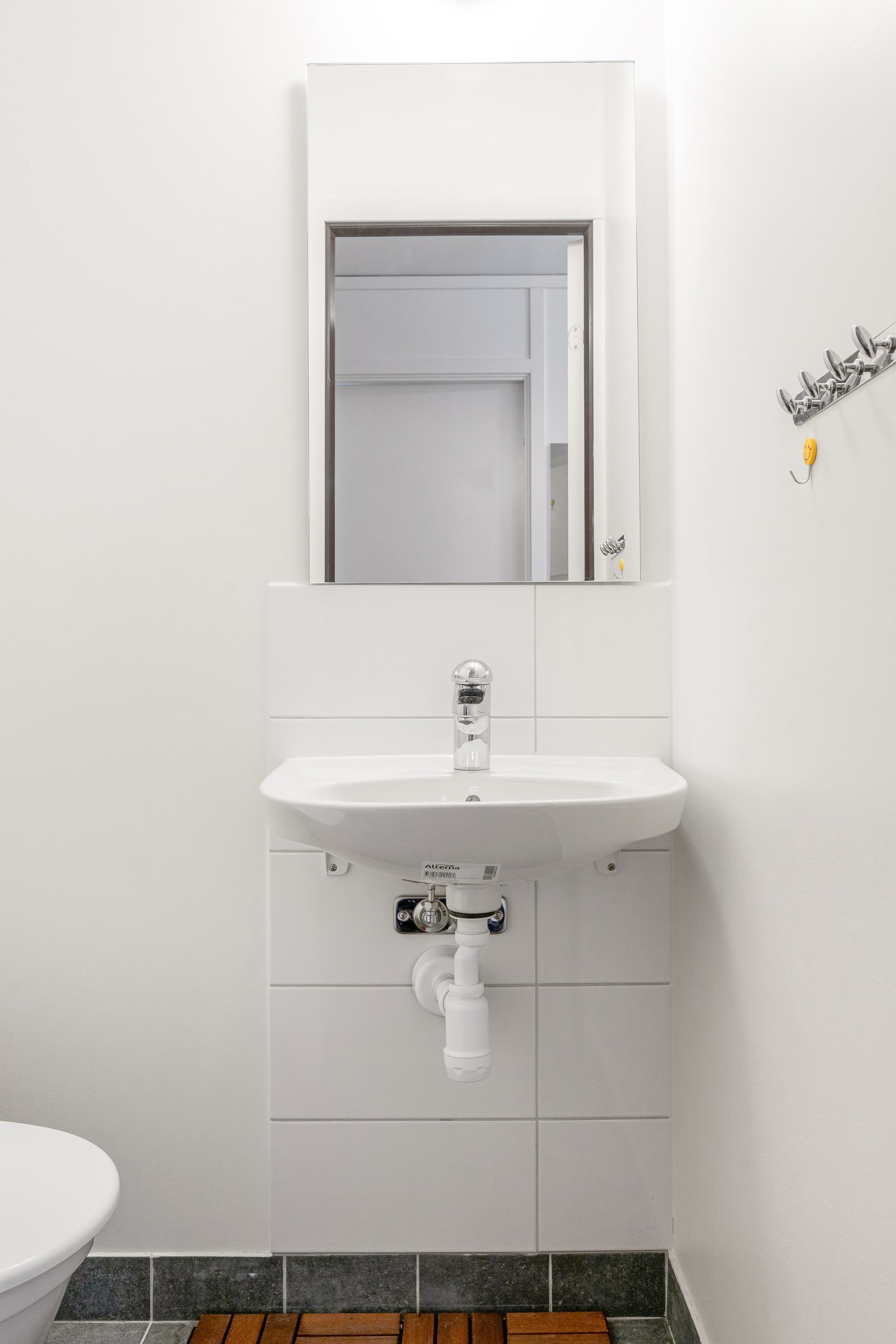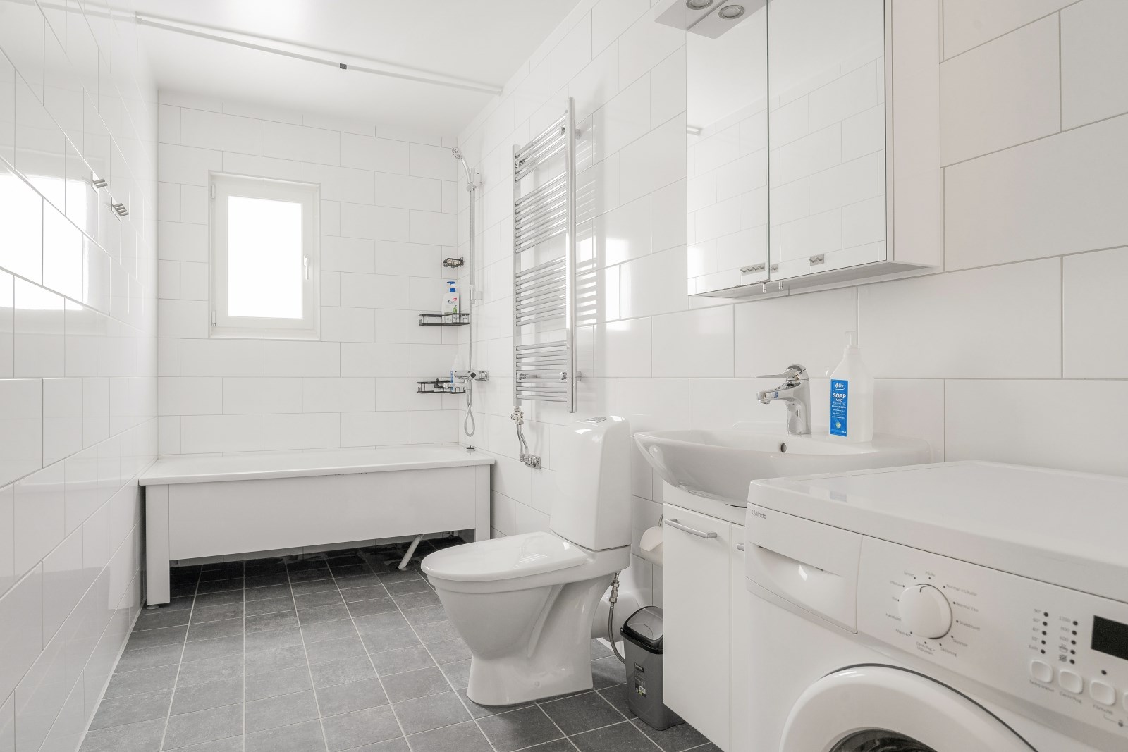 Helkaklat badrum med fönster. Badrumsutrustningen består av: wc, badkar, vattenburen handdukstork, kommod, spegelskåp samt tvättmaskin. Detta är ett badrum man gärna spenderar tid i!