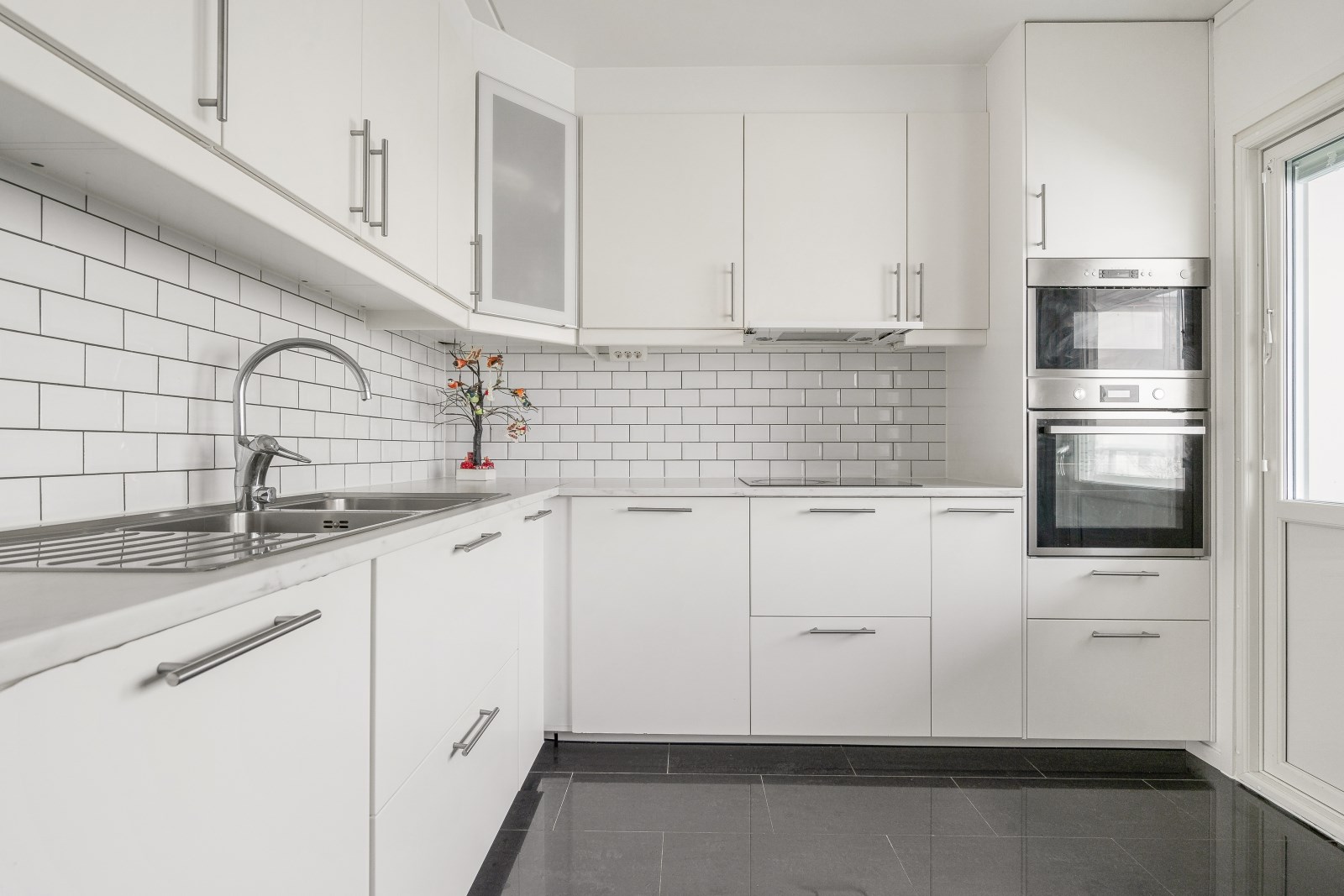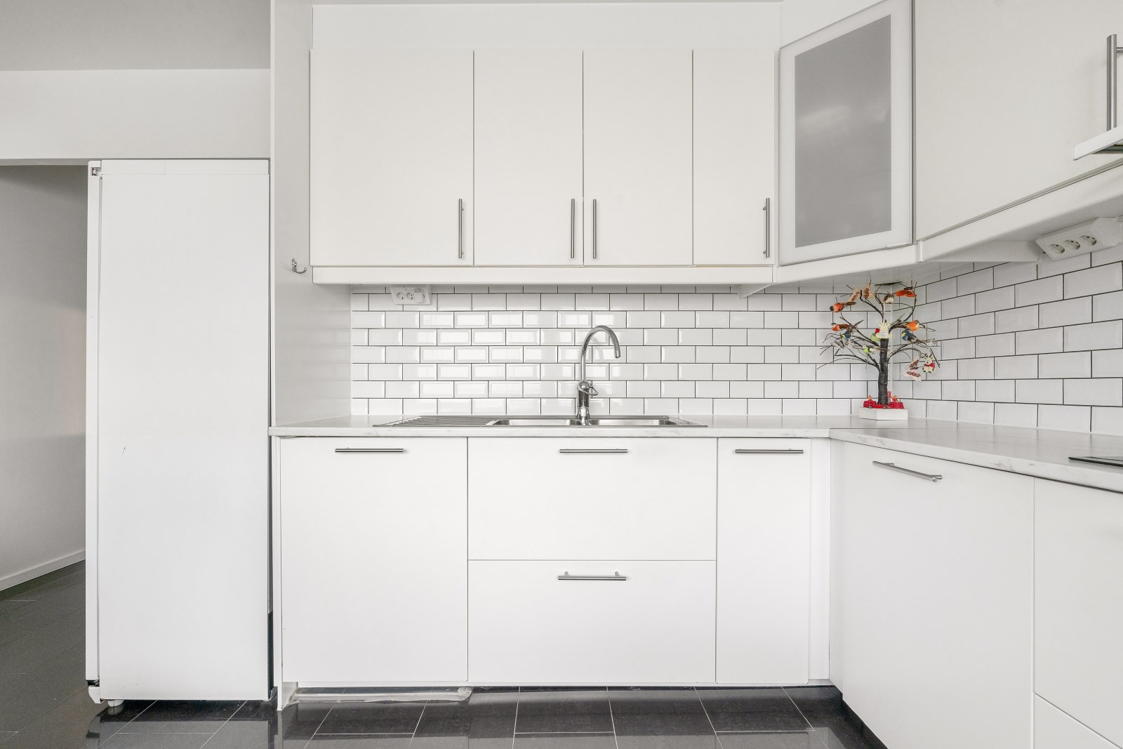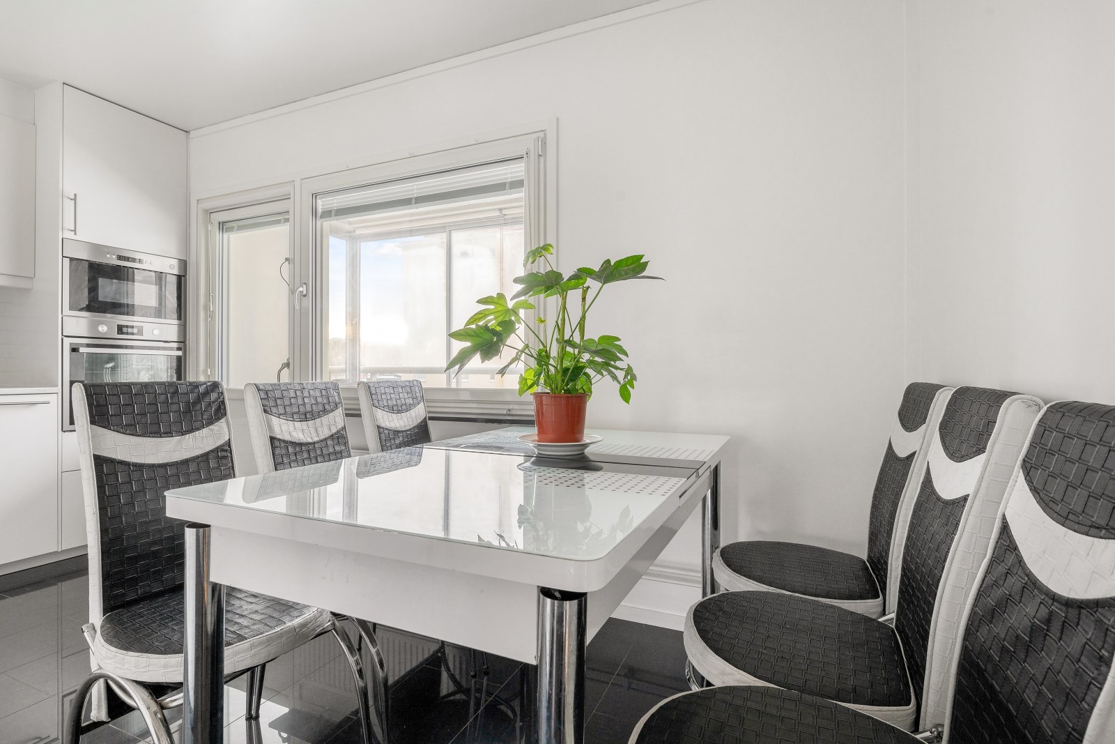 Stilrent fullutrustat kök med matplats invid fönstret. Här erbjuds gott om förvaring och mycket bra arbetsytor som underlättar matbestyren. Kökets maskinpark som består av: inbyggd micro, inbyggd ugn, integrerad diskmaskin, induktionshäll, fläkt, kylskåp och frys. Här blir det ett nöje att laga mat och bjuda hem gäster på middag. Från köket är det utgång till lägenhetens rymliga inglasade balkong.