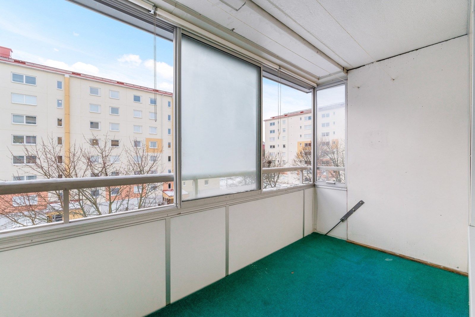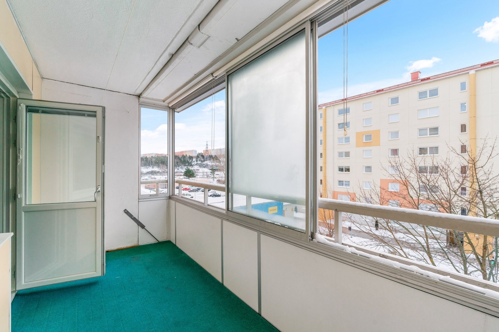 Stor inglasad balkong i soligt söderläge. Balkongen bjuder på gott om plats att möblera med utemöbler och blommor. Det här kan bli en riktigt mysig plats för avkoppling där de praktiska skjutbara glasdörrarna kan öppnas upp eller stängas till efter säsong. Inglasningen möjliggör också en utökad användning under året