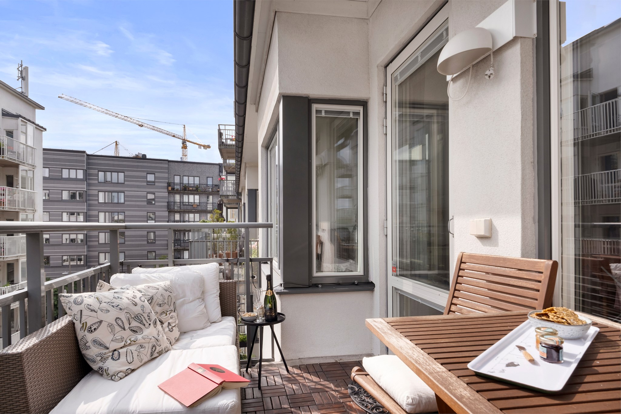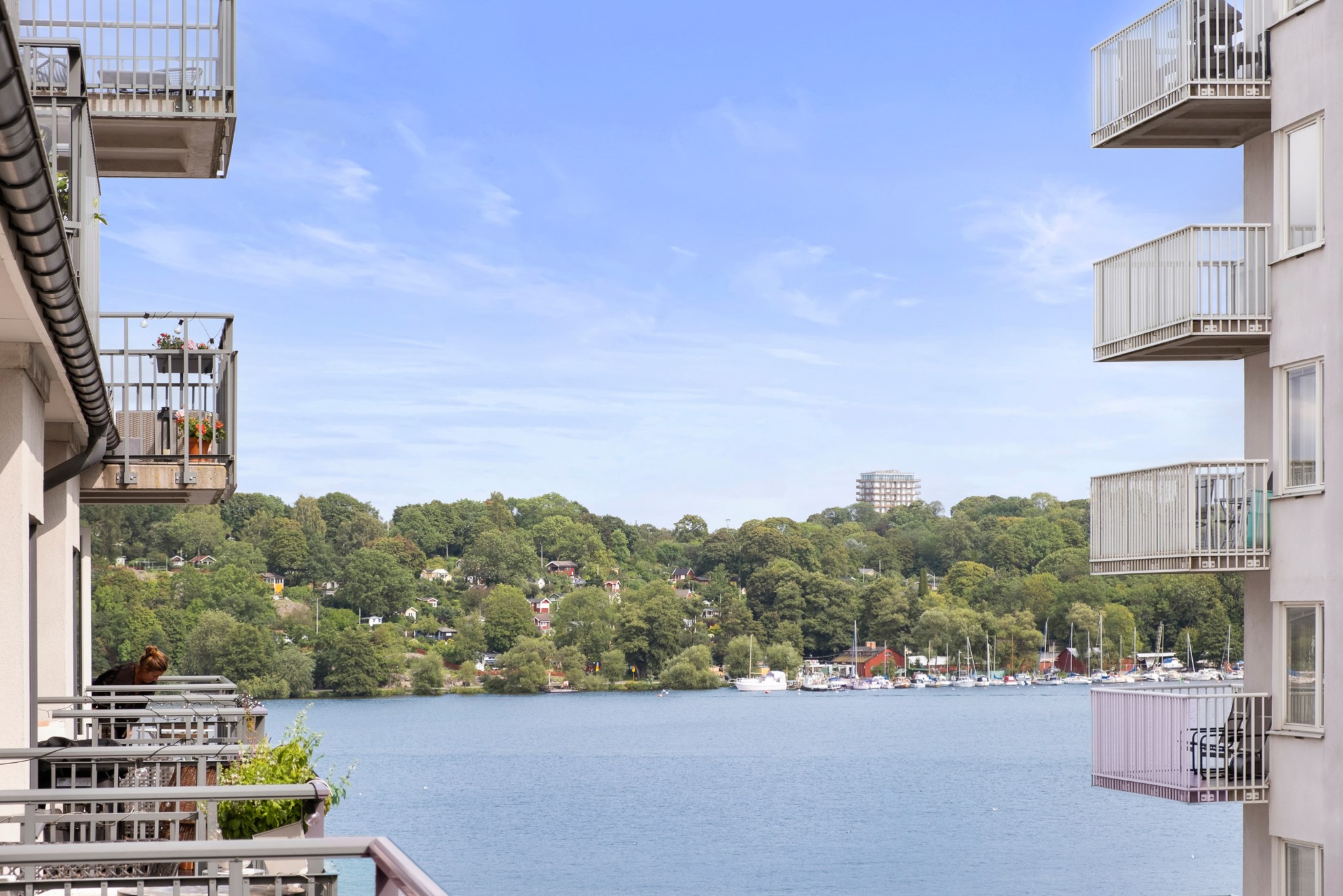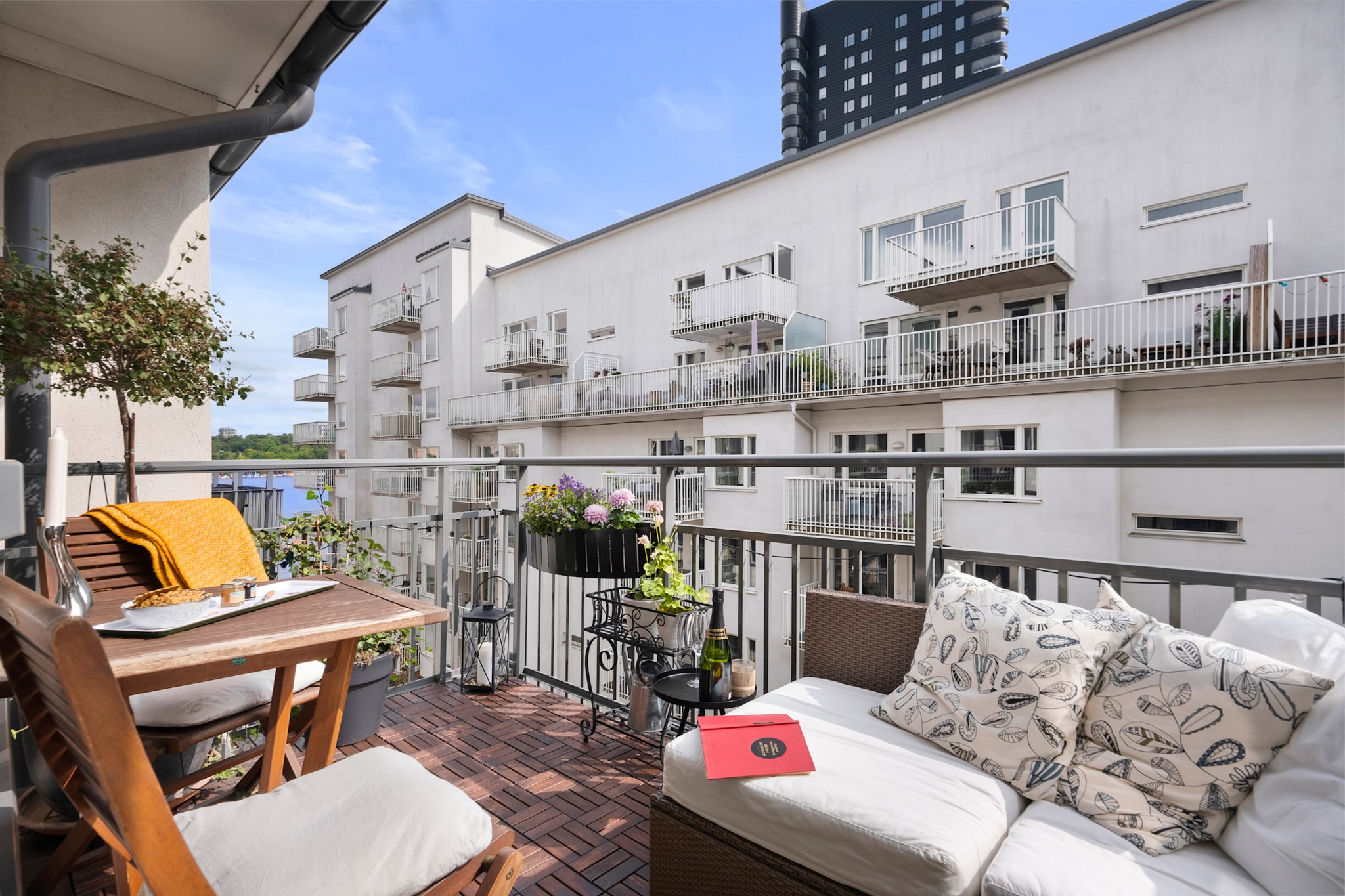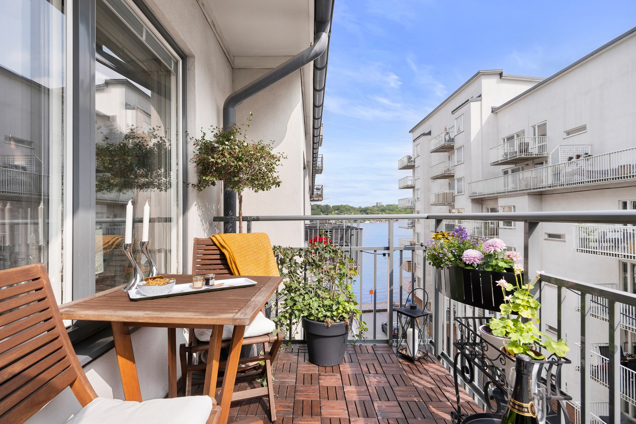 Fem våningar upp i huset finner ni denna ypperligt planerade och sjönära 3:a. Underbar balkong i sydost med sol från morgon till eftermiddag samt en fin utsikt mot Årstaviken, Tanto och Södermalm