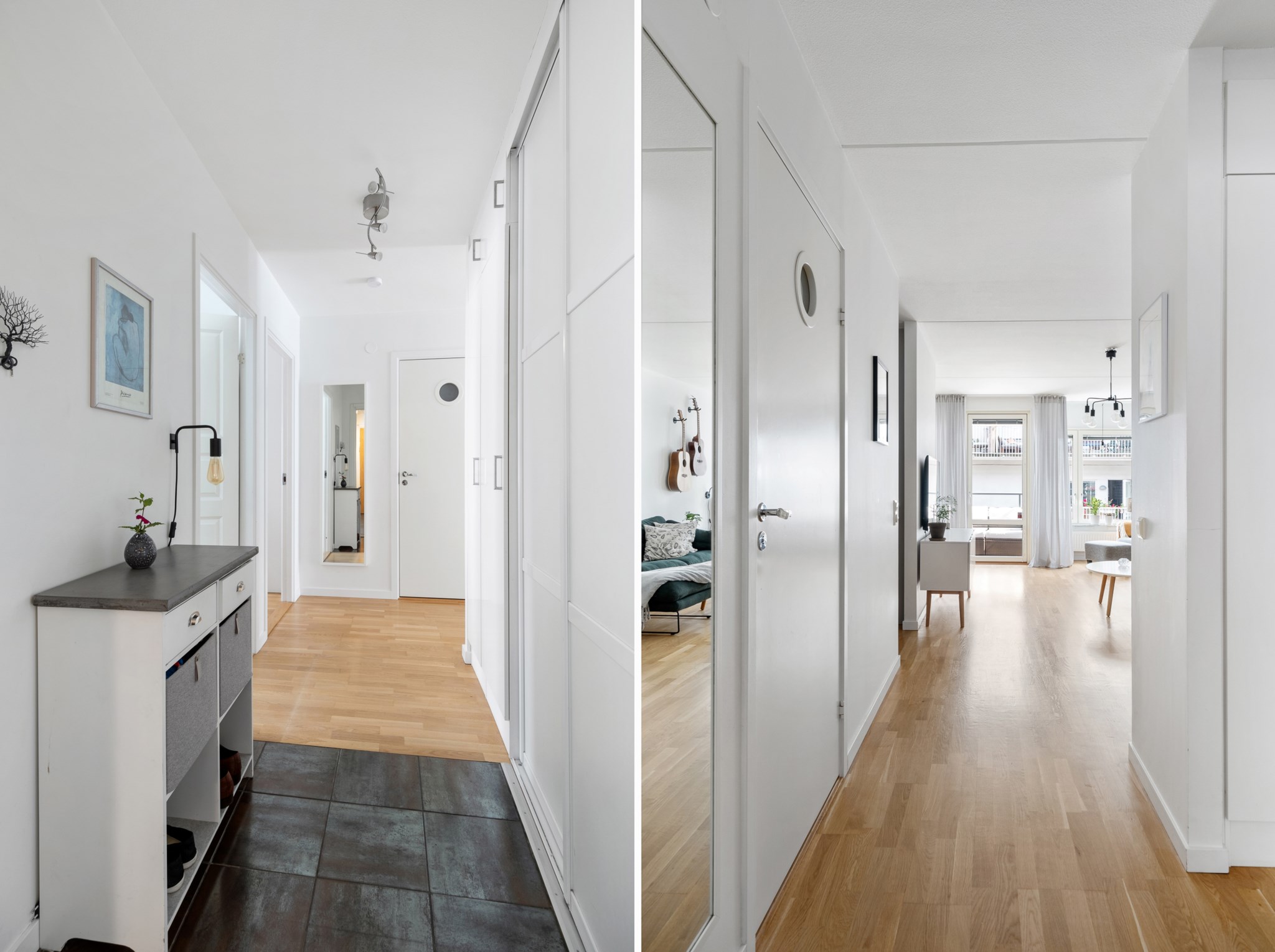 Välkomnande hall med avhängningsmöjligheter och förvaring i flera garderober.