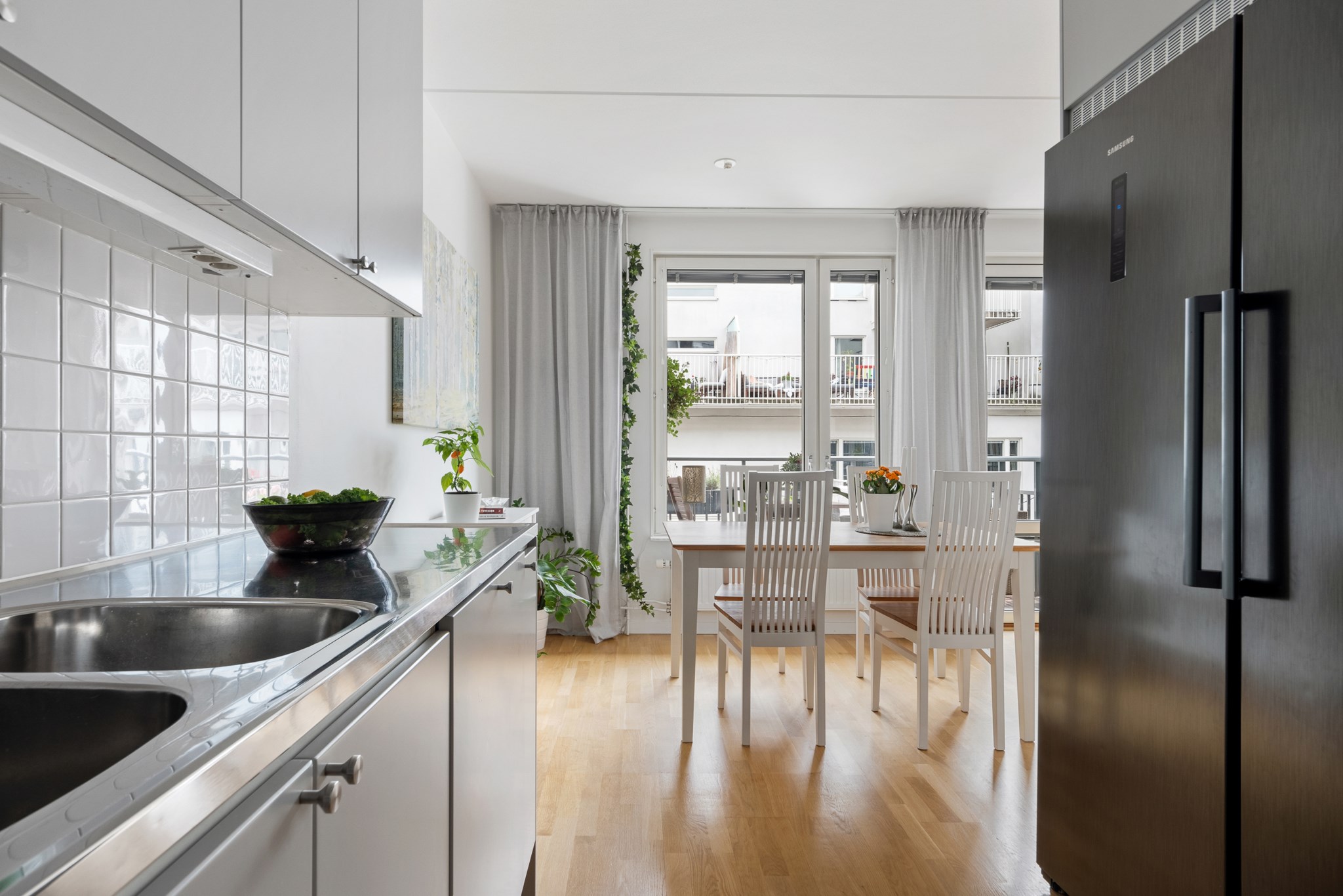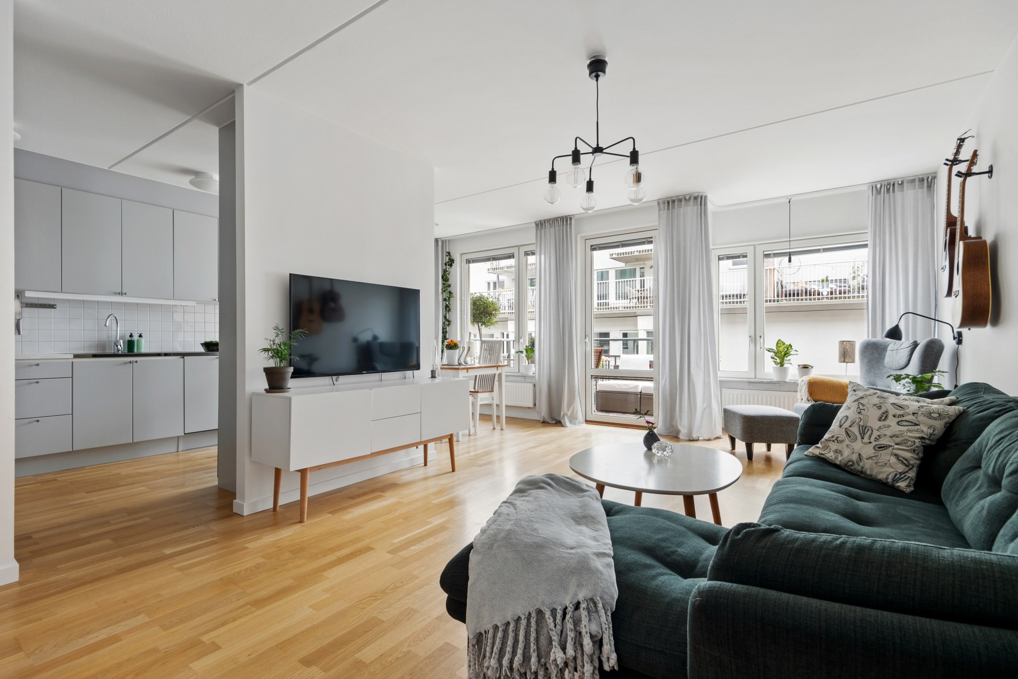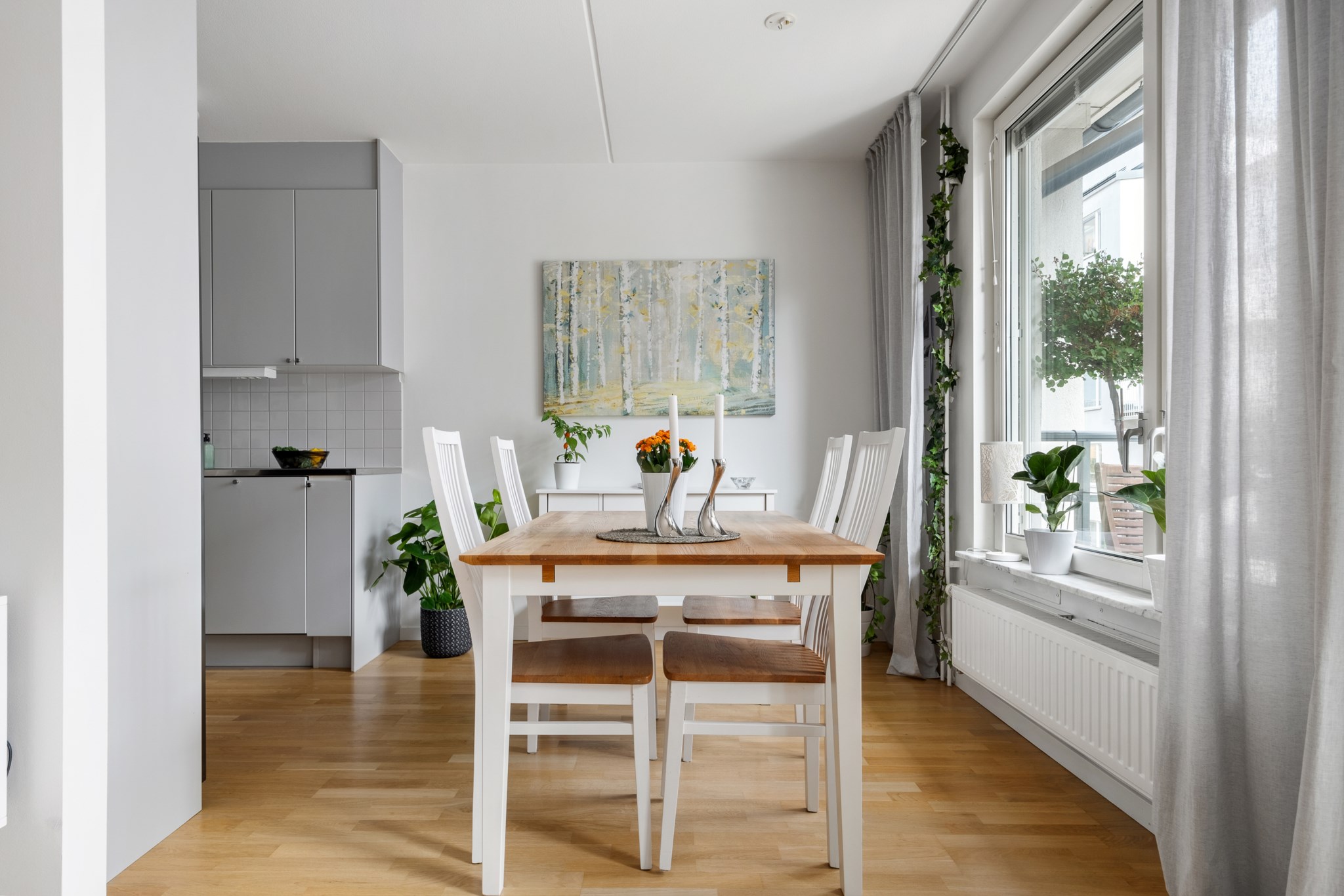 Trivsam och lugnt belägen med genomgående planlösning och massor av ljusinsläpp via stora fönsterpartier. Den extremt yteffektiva layouten gör att bostaden upplevs härligt rymlig och större än vad siffror anger. Den öppna planlösningen mellan kök och vardagsrum inbjuder till socialt umgänge och låter ljuset flöda fritt mellan rummen.