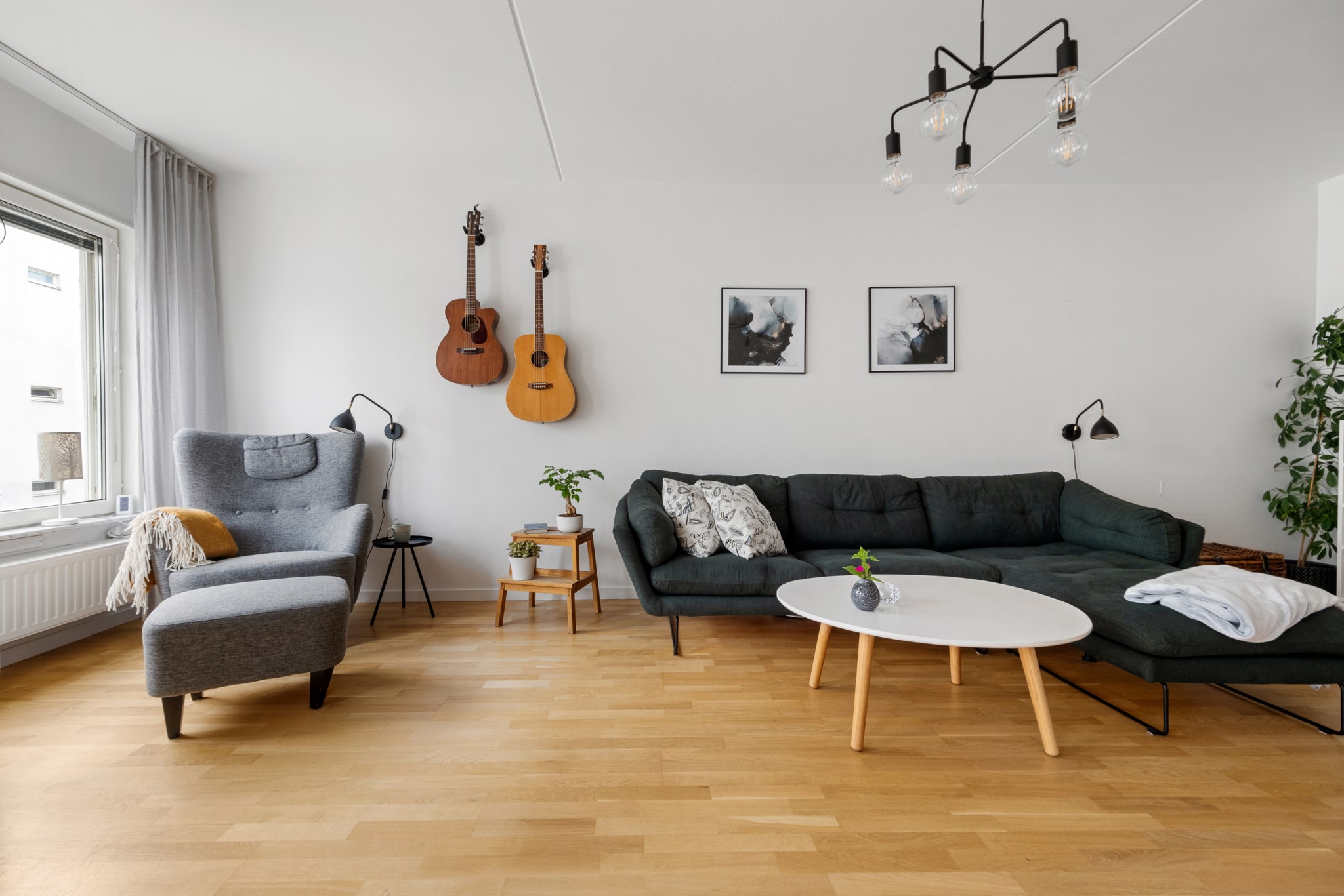 Vardagsrummet är stort och här rymmer ni utan problem en större soffgrupp, bord samt ytterligare en matplats om så önskas.