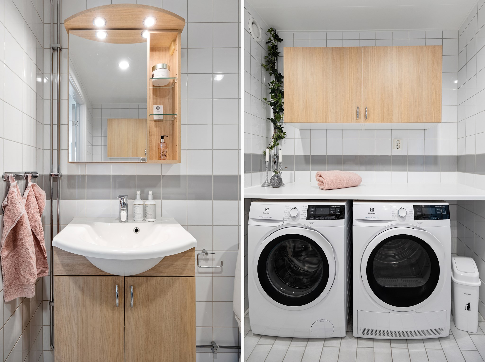 Badrummet är stort och placerad i hallen. Ett snyggt och helkaklat badrum med wc, stort badkar samt en mycket praktisk tvättavdelning utrustad med tvättmaskin, torktumlare, skåp och arbetsbänk.